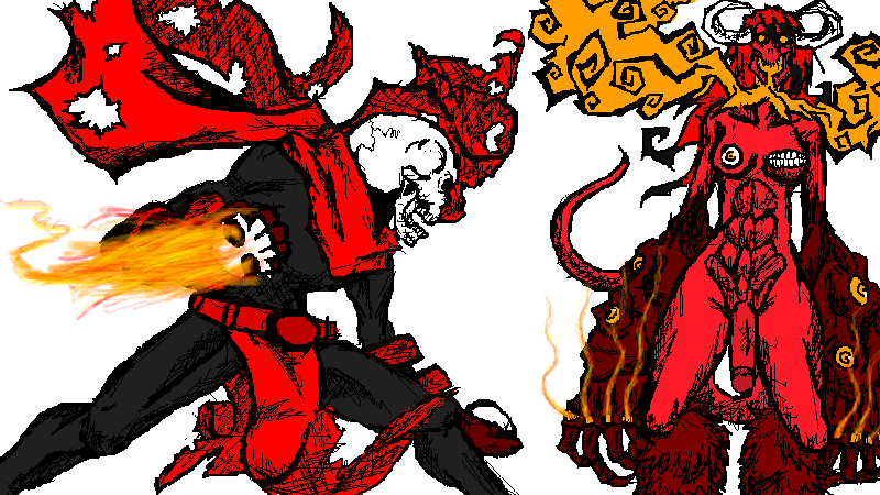 >>31721I don't know if this is allowed here or not. I'll cross-post from /writ/ or just link to dA if I have to. But here goes:-~-~-Magma bubbles and pops in an obscene orchestra all around us; the pools of molten rock segmented by strips of volcanic earth, rich black soil, land bridges of varying width and solidity. The sky was a blood red; there were no clouds, no birds. No discernible star or planetary satellite. The light that allowed us to see certainly came from the pits of flame, or some unforeseen otherworldly source. Didn't concern me much. Neither did the fact that I don't really remember how we reached this place. Only that it brought a harsh reality to my attention, and a terrible sense of familiarity that I was not comfortable with.<b>"HERO!"</b> The situation only got worse and worse. <b>"Is your memory coming back to you yet?! Allow me to jog it!"</b> Without great warning beyond its...subtle...threats, I came under attack...the great demon Formaldehyde swooping for me, my agility barely allowing me to dodge a wide sucker punch.With a snarl, I made a dash back as far as I could, until I found myself at the edge of a magma pool. Only a few yards separated myself and the beast; I was between a rock and a hard place rather suddenly, having been quite relaxed only moments before. "Where are we, demon?! Explain yourself!" I stood in a ready stance...thumb pushing up the end of my fashionable walking cane, revealing the blade hidden inside.The hermaphroditic demon snarled before letting loose a voracious cachinnation, knuckles flexing and cracking in anticipation. <b>"Your <i>home</i>, hero. Or have you forgotten? Yeees...your escape from here has destroyed a great deal of what made you so respectable, once upon a time. <i>Tragic</i>."</b> It lunged forward on widespread wings, and I echoed its movements...diving beneath the beast's body, and rolling away before I could be made victim of its tail.Buh...my head had been entirely too close to its genitalia for comfort.I couldn't keep myself from panting as I stood up. "...Buh...bah! More riddles! Speak plainly! Where are we? What do you know of my connection to this place?" In all the time I'd spent without a memory, I'd never really contemplated my origins...so what could this hellspawn know of......Hellspawn...<b>"Yes, yes...you understand, then? The bowels of Hell have waited for you, <i>hero</i>! For your return! I know <i>all about it.</i> A lost soul, yearning to break free! Unlike so many, you succeeded!"</b> The demon raised its arms high, as though it were praising me.I'd heard enough.With a quick movement, I flipped open the top of my cane, and pressed a button inside. A brilliant flash, and my costume had adorned my frame; equipped enough to deal with this beast. "Boringer! I've had enough of your lies, Formaldehyde! I don't know where we are, but I'm well prepared to beat the answers out of you!"<b>"NO, HERO!"</b> The creature hunkered down, roaring out, and slamming its fists and tail into the dark earth...sending tumultuous quakes through it, making the magma pools unsettled. A prospect I didn't enjoy. <b>"I'm tired of <i>your</i> lies! Your treachery! You tricked me, made me believe in your world of mundane pleasantries! But today I woke up! And I remembered who I was! Now <i>you</i> remember who <i>you</i> are!"</b>WIth a speed I'd not known before, the creature slammed into me, sending me back...there was no wall to stop me. This place stretched on forever. So I flew until the momentum died...skipping like a pebble across seas of lava. My suit was badly singed...the front of my mask had melted away. Damnable...<b>"DEAD! You're DEAD! AND NO DEAD ESCAPE FROM HEAVEN! YOU'RE A HELLION, AS I AM! YOU MUST BE!"</b> The whole time I skipped and skidded, the creature was close behind...a frightening prospect, my world a blurred vision of liquid heat, tainted soil, and persistent beast. When I finally came to a stop, rolling gently on the luckily soft ground, I was very quickly pinned down by a powerful stomp. The sickening noise of my bones cracking under the demon's strength was almost too much to bear.<b>"Your sickening kindnesses and gestures...your attitude, your personality...it doesn't make sense to me! You defy logic! How does a someone escape this place and become a hero?! Not only that, you had even begun corrupting me, and those I had corrupted myself! I WON'T STAND FOR IT ANY LONGER! I WILL REMIND YOU WHO I AM, AND THEN SHOW MYSELF TO THE WORLD!"</b> With a kick, I was sent rolling again, my mind in a temporary daze from the pain-substituting pulses of my body, like my entire skeleton was a subwoofer.Formaldehyde busied itself by other means...crouching down, body tensing...as the flames from the pits gathered to it, encircling the beast, before diving into its body...but it certainly wasn't burned. It only grew larger! What had been a shapely, mostly human figure transformed...growing hard plates over its body, forearms growing to a ridiculous size and steaming from the heat they held. Eyes glowed brightly, intently...mouth steaming along with it and the rest of its body....Daunting.<b>"DO YOU UNDERSTAND NOW, WHAT IT IS I AM? WHAT IT IS YOU FACE? I AM THE EMBODIMENT OF WRATH, OF WANTON LUST. I AM THE DARKNESS NOT AFRAID TO STAND IN THE PRESENCE OF THE LIGHT. THE LIVES OF SO MANY THAT LIVED FOR PLEASURE AND DEATH. YOU FACE THE MEN YOU WERE SO EAGER TO PROTECT, <I>HERO.</I>"</b> Its voice echoed at a volume that was difficult to withstand. All the same...I got to my feet. <b>"YOU'VE MADE AN ENEMY OF THE WORLD. I CANNOT BE SLAIN, HERO. AS LONG AS SIN REMAINS IN THE HEART, <I>I</I> REMAIN."</b>My gloved hands slowly came up, and I unfastened my mask from its clasps. Someone wasn't going to be happy that it was in such disrepair. "...You choose your allies poorly..." The words came in ragged gasps...it was much less dramatic sounding than I'd hoped for.<b>"AND WHAT OF YOURS. YOU THINK YOUR FRIENDS CAN SAVE YOU FROM 