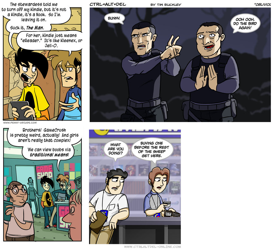 >>31972>Taken at face value, Penny Arcade and Ctrl Alt Del are about equal in terms of visual style.I disagree vehemently. I think there's a significant gap between the talents of Gabe and Buckley. Even when it comes to design. Both are highly stylized, yes, but only one seems to understand what humans are kind of supposed to look like, and how they move. That would be on the left. There is a sense of motion and proportion you don't see on the right side. The right side is rather stiff, and more than a little awkward looking. It doesn't really flow. It's also a little rough. not really in the "this is intentional way", but more in the "I'm not sure how to do this" sort of way.But, to be fair, Gabe has been drawing pretty much every day for about 12 years now. Penny Arcade used to look fucking horrible. Again, being fair, Buckley has significantly improved as well. But at face value, disregarding backgrounds, writing, etc, the characters that appear in Penny Arcade are more aesthetically pleasing/interesting.