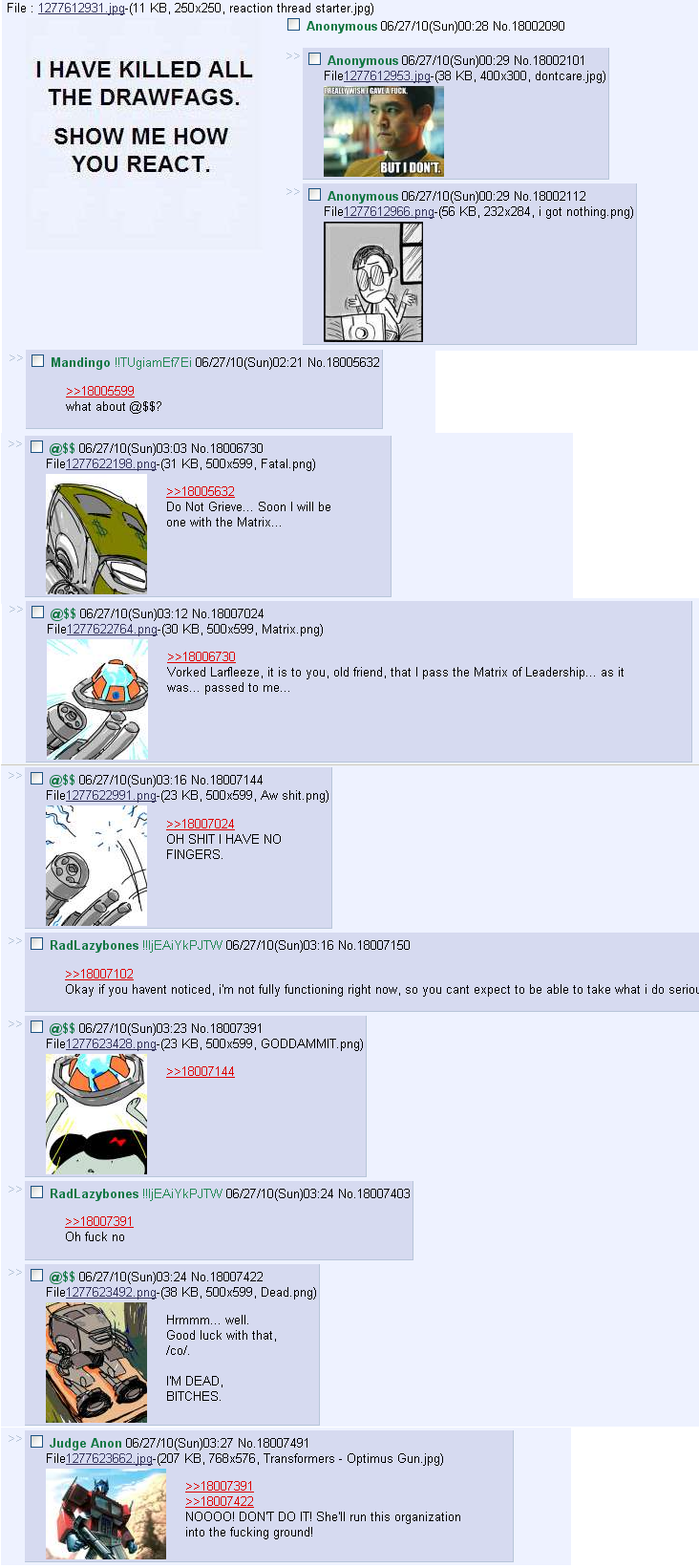 >>33989 >Welp, looks like I'll never be able to post on /co/ again thanks to the spammers!Actually, thats just a phase of new introduction on /co/. Sagebombing a thread with non-/co/ related material can be reported, since it breaks the rules.But honestly, if you're doodling for any reason on /co/ besides just to amuse yourself and to see what reactions you get, you're doin' it wrong.