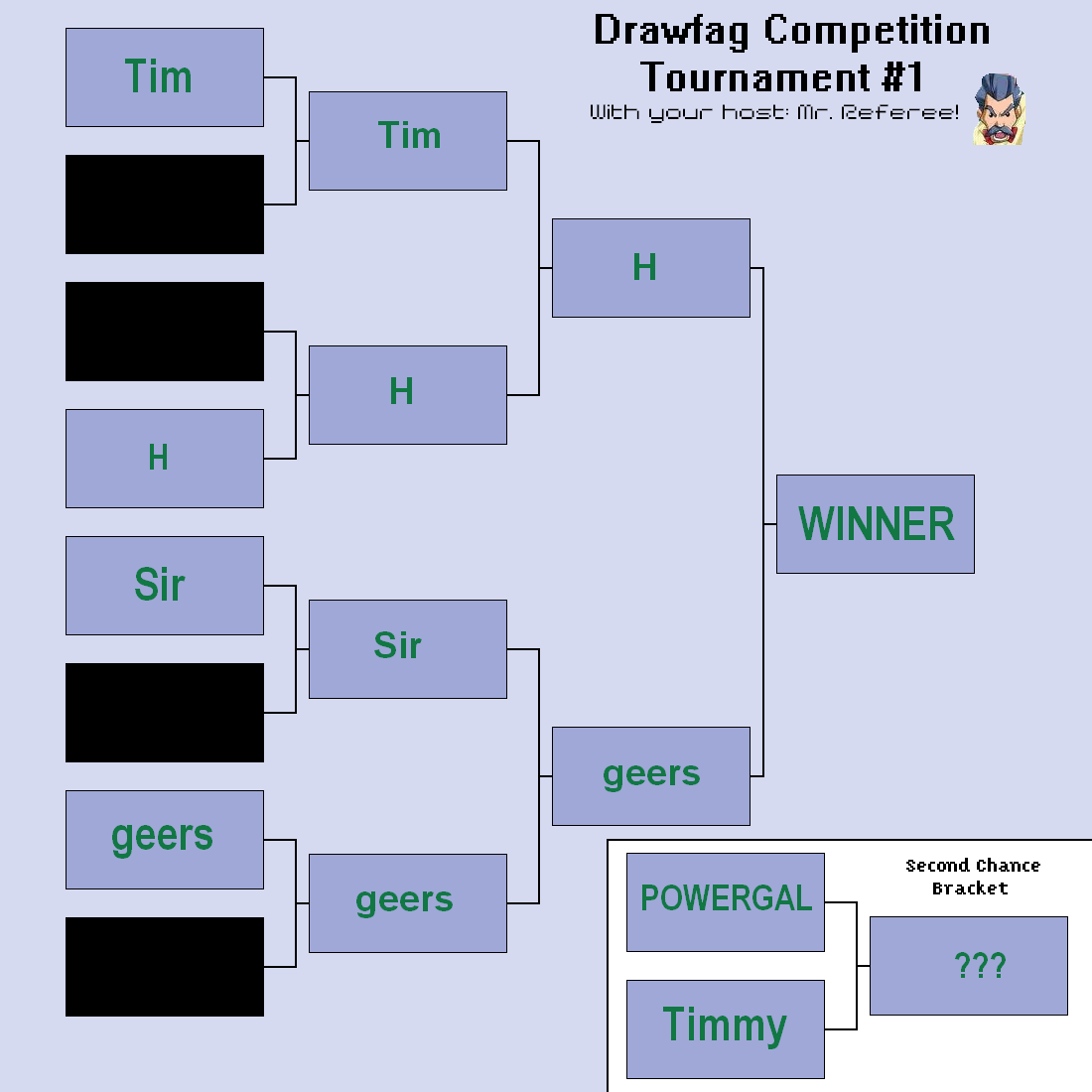 >>35774>>35783I really don't want to ban people from this since it's supposed to be fun, but I suppose it's the only fair thing since it's disruptful for the tournament. So I guess we will.Anyway, no word from Tim, so H moves on I suppose.As for the other two:POWERGAL VS timmyhttp://www.snappoll.com/poll/339729.phpgeers VS Sirhttp://www.snappoll.com/poll/339730.phpVoting closes on Wednesday, then the finals will be given out and we'll go from there. Thanks to all who participated.