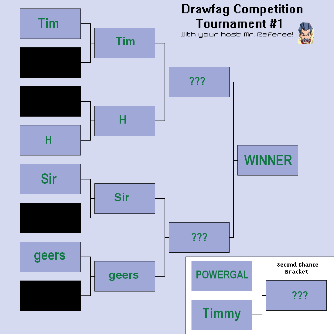 We should probably have a mediator to oversee the project. Someone who will choose which requests go to which drawfags, which drawfags will be pit up against whom, when the drawings are due and whatever little organizational responsibilities. Preferably someone who'd take the time to create the threads and create a little chart showing who's won and moving onto the next round.And preferably not a contestant. Any volunteers?