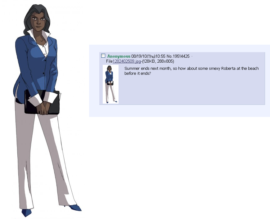 >>35720I dunno what I like more. Sexy Roberta in a bikini, Pepper being jealous in the background, or the fact you managed to fit the 'abloo bloo bloo' joke in there.