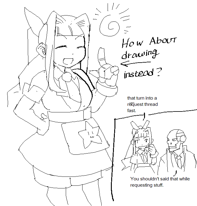 I don't mind people posting requests in this thread, I kind of want some interesting ideas I could try to illustrate. Something absurd or silly.I don't mind drawing porn. Usually it's just boring, repetitive, uninteresting and tedious. I might be interested if I'm bored enough.I'd rather have people contribute something themselves too. Especially people who usually never use mouse and ms paint - for interesting results.