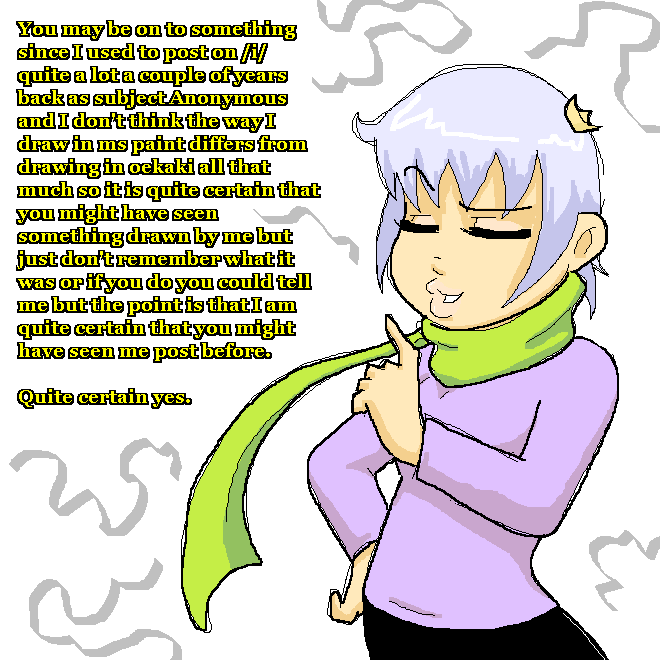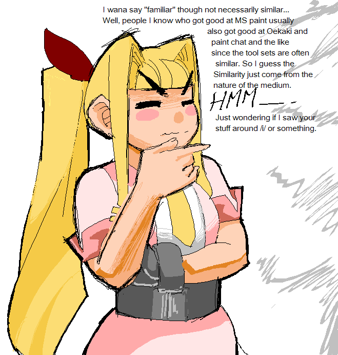 I tried skimming the pages for a thread dedicated to mouse drawing with ms paint only, but couldn't find one.I think there should be one, because they are the ultimate tool in the history of drawing. Discuss and post.