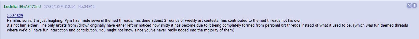 >>34854>>34853I'd say if you draw it, it's /draw/-related. You shouldn't feel the need to censor yourself. This place has a NSFW tag for a reason, after all.As for >>34846 and >>34844, I was being my characteristic glib self, but I will admit my timeline is different than yours. To me, Pym's problems seem to stem from what's currently on the front page. The last time I remember him creating an "adventure" thread like the ones he likes so much was back in early June, which turned out nicely and everyone seemed to have fun. Checking through the back pages, there were a couple of other "skit" threads created by other posters as well, with varying participation. I don't see how current /draw/ has become shitty just because people (like myself) have personal art threads. If we look at the purpose of /draw/ in the FAQ, it's: "Oekaki, art, etc. A place for /co/'s Drawfags." As long as people are drawing, whether its adventures or personal art for comments, criticism, or self-improvement, I don't see how that is "shitty" behavior for the board.As for myself not knowing about how /draw/ "used to be" because I didn't post in the themed threads, just because I don't post in them doesn't mean I don't read them. I don't post in them because I don't feel I have anything particularly funny to add.I'll admit I wasn't sure whether I should post this response or not, as I feel like we're ruining the intended purpose of Banquette's thread with all of this discussion over /draw/, but I did want to make my position clear.