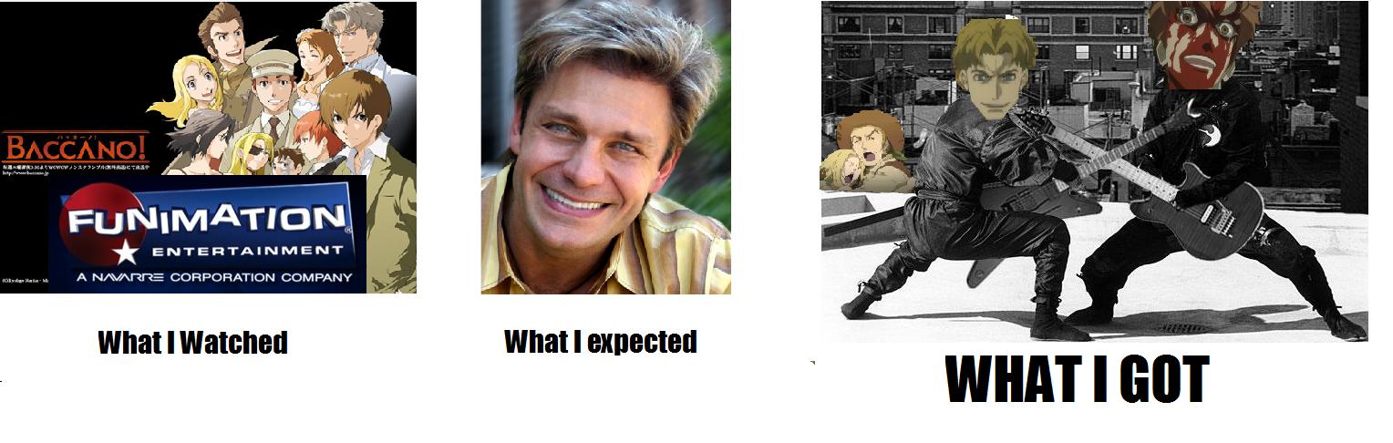I oh man, I love Baccano~ I marathoned this series for an entire day. CRIED at how good it was. Went back to rewatch the next day. my second favorite character is Jacuzzi. because Issac and Miria are always my favorite.pic related. Because that's what it's like. That feeling when you are watching Baccano.