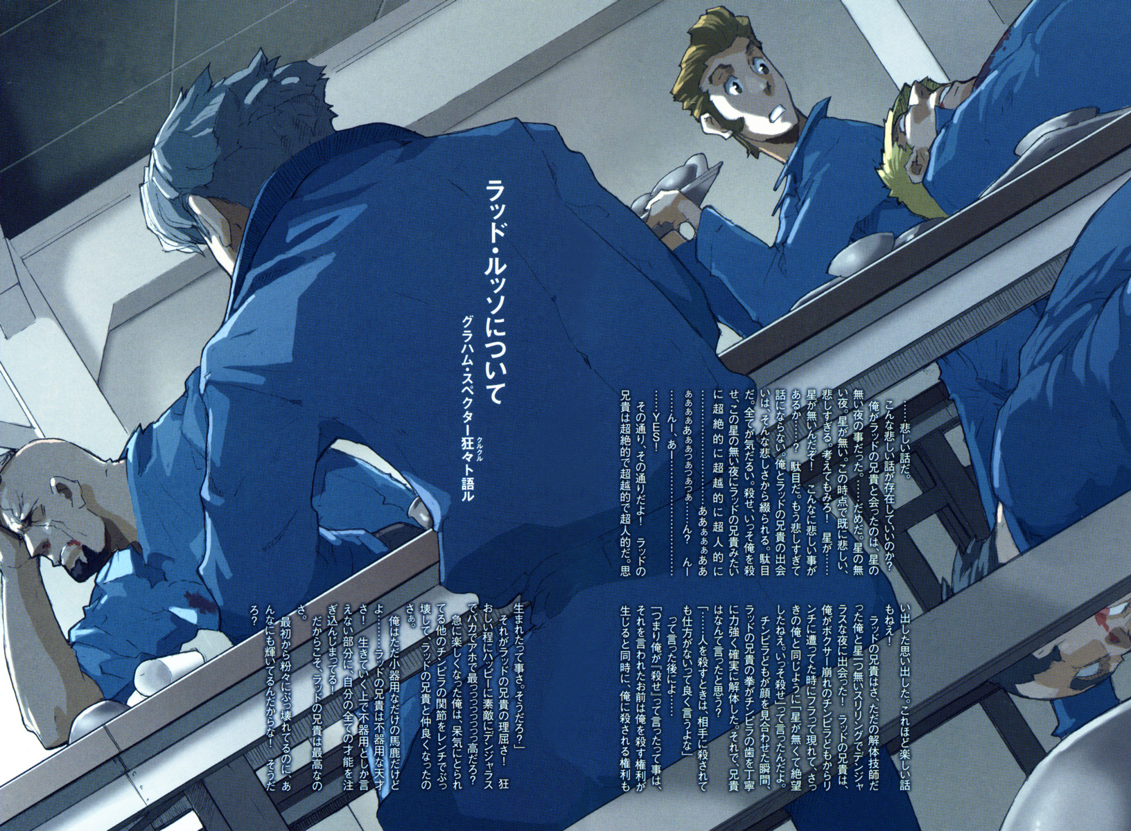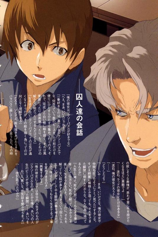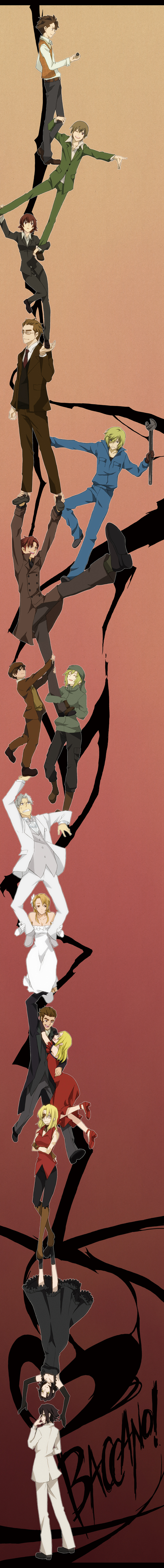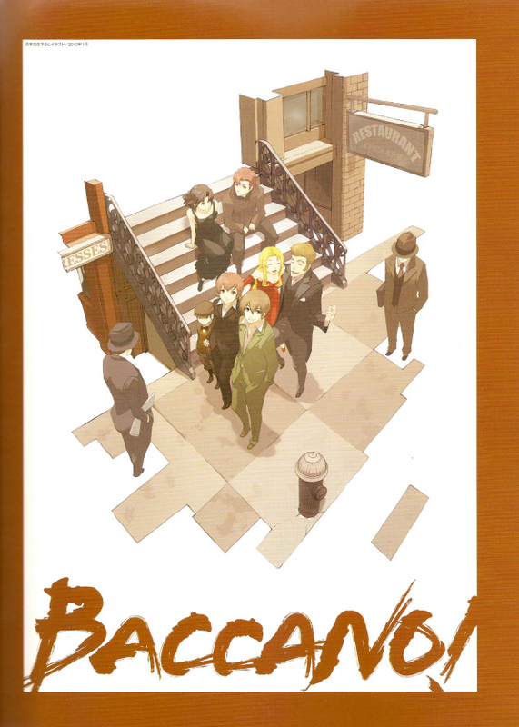 OKAY! So a few months ago, the artist for the Baccano! novels finally put out a DELICIOUS ART BOOK. The fangirls and boys over at the Baccano! LJ comm. are finally getting their hands on it and posting scans and I thought I'd share them with you guys because the majority of them are pretty fucking cash. Some of it is new stuff, some old, all awesome. I would give ANYTHING to own this fucking book, swear to god.