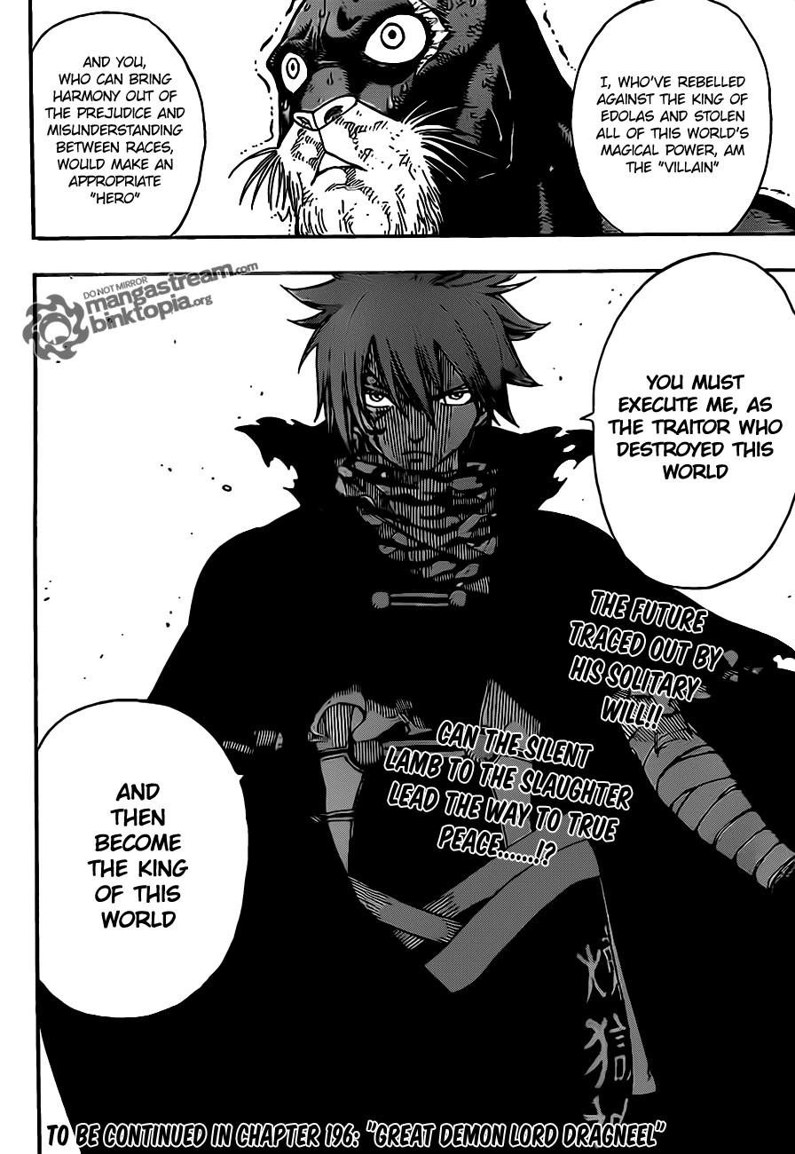 WAO~Chinese scans of 196 is out. From guesswork, the Dragon Slayers seem to pretend to the public that they stole Edolas's magic by defeating their king while Mystogan and Pantherlily argue.They also try to pose as monsters. Pic related.