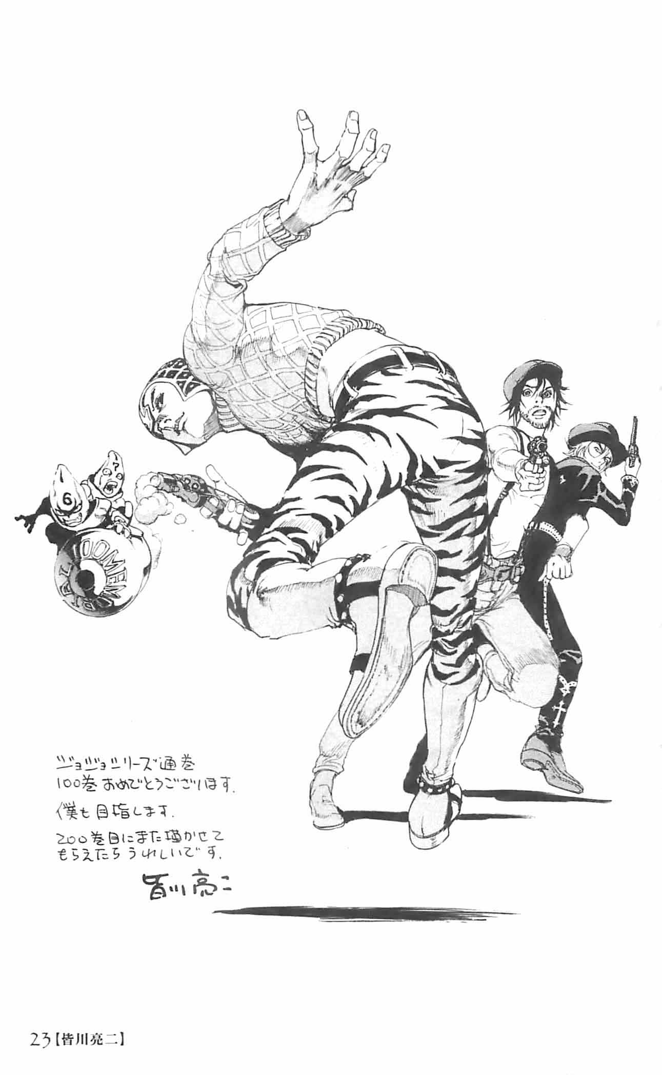 So because of the 100th volume coming out, Ultra Jump is releasing a booklet with sketches and comments from various authors and stuff. (like they did for the 10th anniversaries of One Piece and Naruto)I don't have all the pages but let's start with this familiar cover.