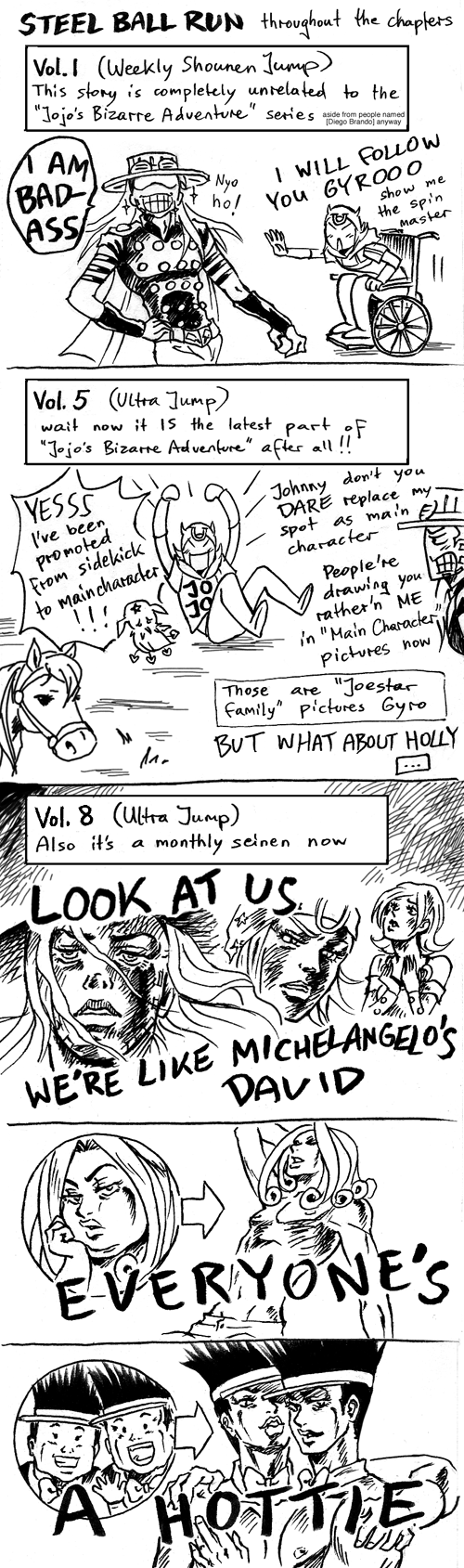 Recently finished Part 3 and up to Part 4. This is series is ridiculous and fabulously stupid and I fucking love it! I'm not sure if I like 2 or 3 the best, 3 was a bit long and took a while to get up and running but I eventually thought it was awesome! and part 2 was just so much better than part 1 which was meh throughout that I enjoyed it a lot too!JJBA has got to be the top shounen manga out there man. Fuck the Big 3 I'm having a blast with this series one in which main characters actually get hurt or die, creative use of powers, some highly detailed art and so forth. Keep rocking Jojo you're the man.