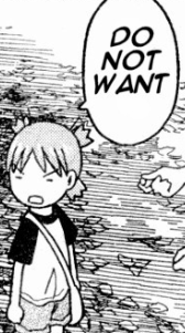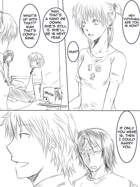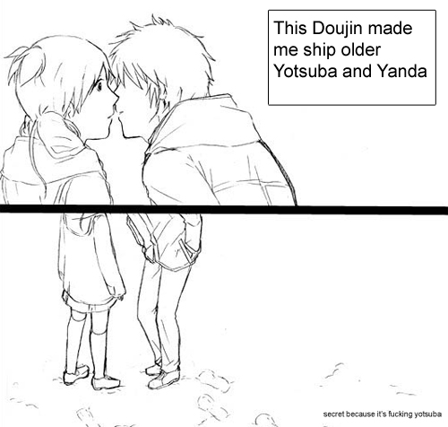 Jesus christ.Guys, guys. I know I said the first chapter of that particular doujin was good, but that doesn't make it a good pairing. The first chapter was good because it wasn't overtly romantic. It was just Yotsuba being teenaged Yotsuba and Yanda being a massive troll, as Yanda is wont to do. Yanda kissed her at the end, but then he ran off going 'lol i stole ur first kiss' like the troll he is, and so everything was fine.It was downhill from there because after that, it WAS overtly romantic, and it really strained at the confines of characterization. One big problem was that, yes, the age gap between them is just too large for regular romantic plotting. It does happen that middle-aged dudes to get it on with high school girls, but doing so in a realistic manner requires a very different form of writing, which really doesn't fit in with Yotsuba.AT THE SAME TIME, GUYS, shipping a teenager with a middle aged person is not at ALL the same as shipping a twenty-something with a five year old. Even if the age gap is the same, I think we can all agree that there is a VERY BIG DIFFERENCE between these. So stop trying to claim that people are trying to hook up Yotsuba as a five year old and Yanda. They're not. They're imagining a teenaged Yotsuba, how she would behave and imagining her interactions with an older Yanda, and shipping THOSE TWO based on that. Not the same thing. Trying to equate them is an obvious false equivalence. Stop doing that.TL;DR, this thread has taken a very sharp turn for the moronic, on every side. Everybody stop saying stupid shit and get back to posting cute Yotsuba shit.