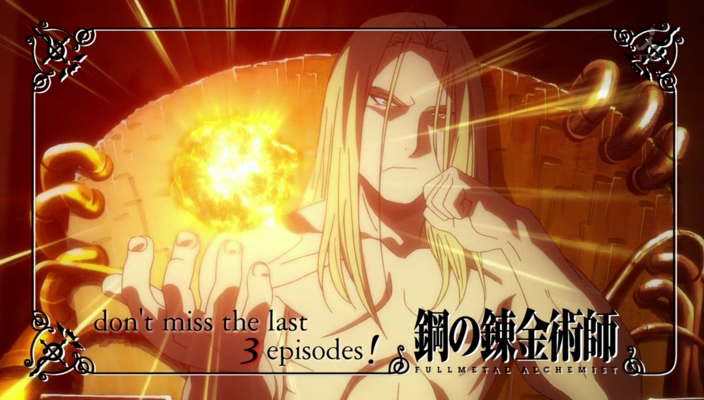 >>45587>The 64th and final episode of the Fullmetal Alchemist: Brotherhood television anime series ended in Japan on Sunday with an announcement that production on a theatrical version has been green-lit.Movie retelling