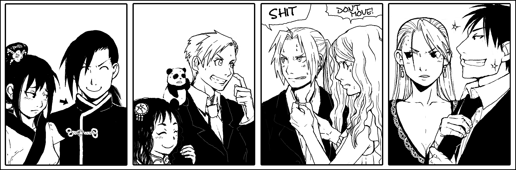 >>45585The Adventures of Al and the Chimera Bros.Includes the royal marriage of Emperor Ling to his bodyguard Lan Fan and their extended stay in Mei's house, during which time Al becomes infatuated with her and agrees to marry her when she is old enough.