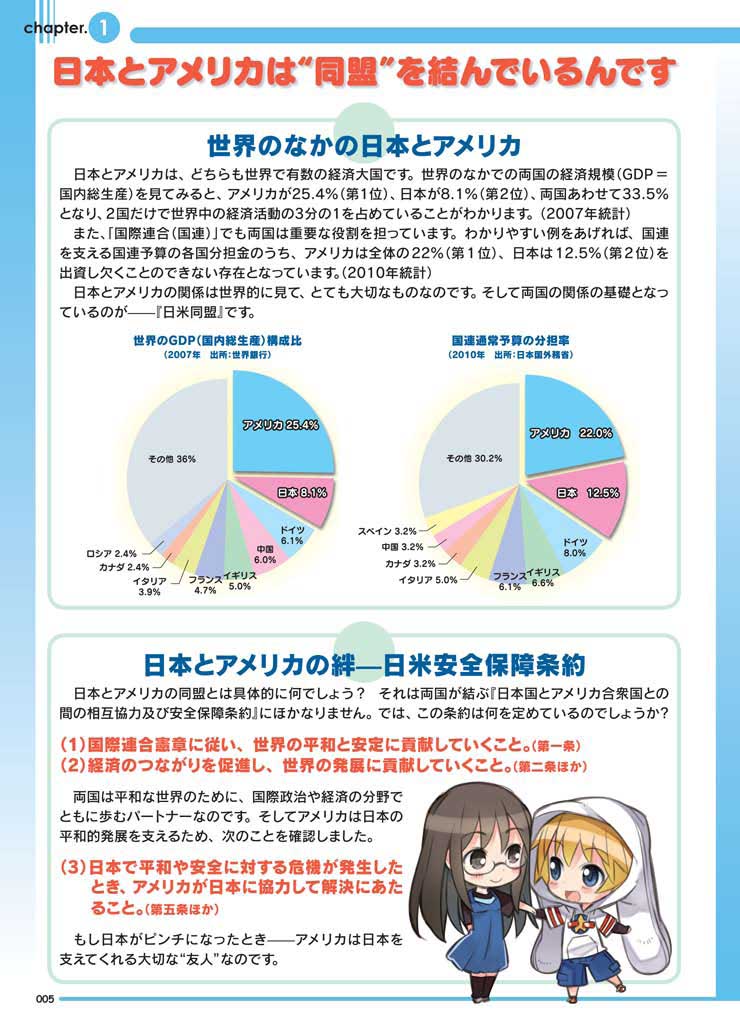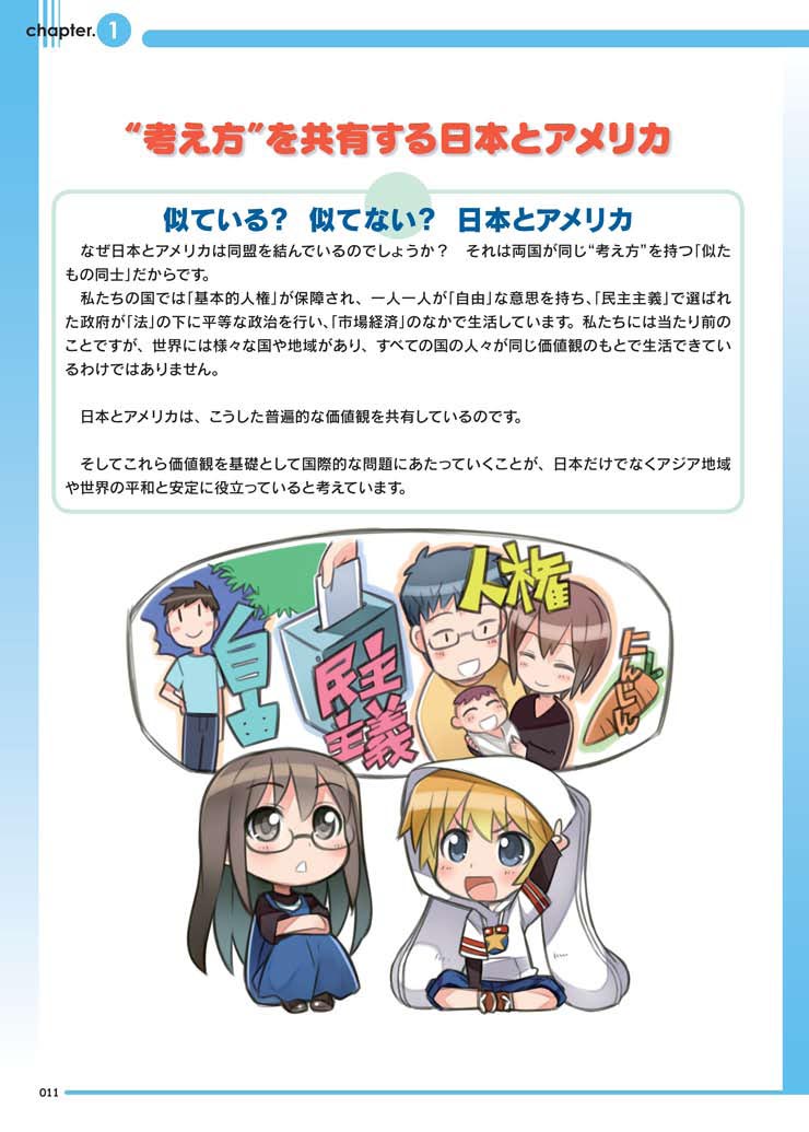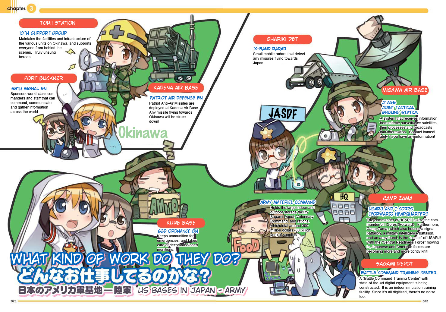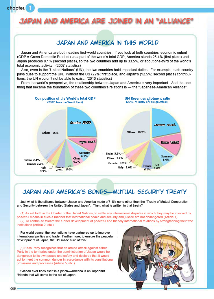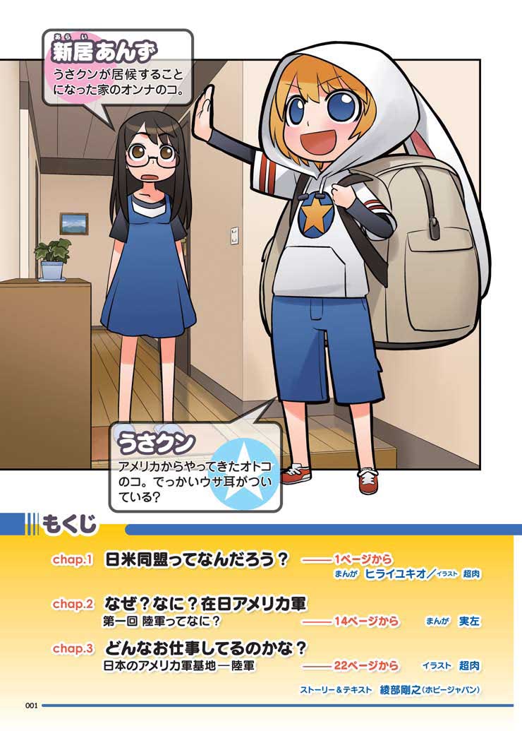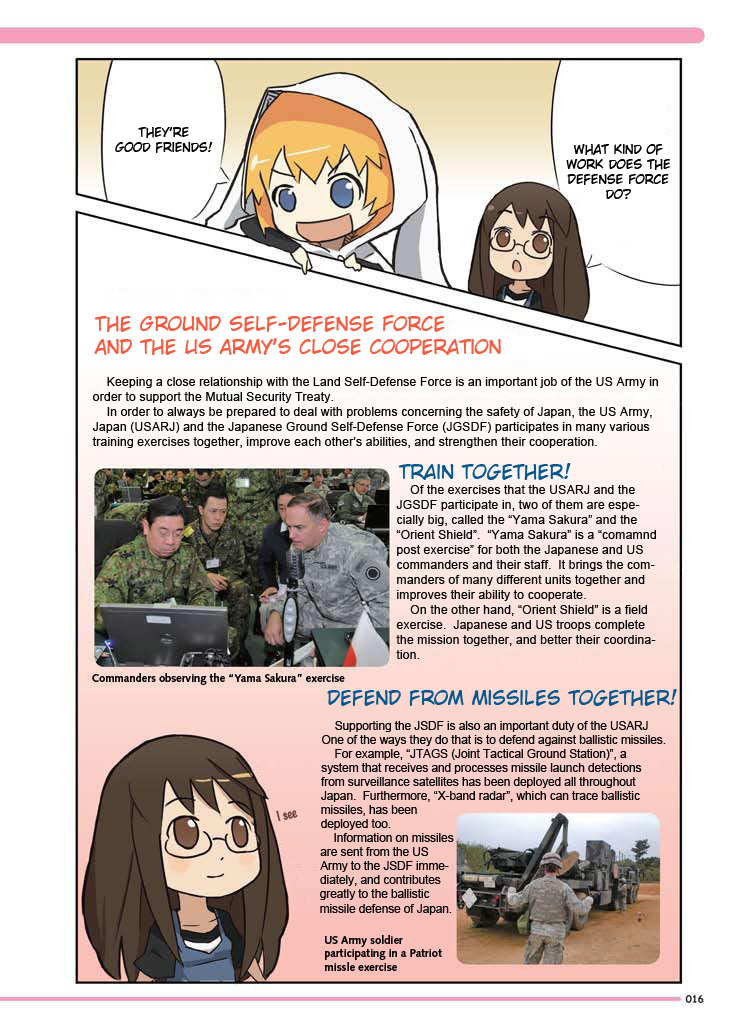 The US military is to use manga-style comics to teach Japanese children about the two countries' security alliance.Four comics featuring a Japanese girl and a visiting US boy will be posted online, each exploring how US and Japanese troops work together.A US spokesman said they were intended as a light-hearted explanation of the history of the alliance.The comics, marking 50 years of the security pact, come amid strained ties over US bases in Okinawa.The first Japanese-language manga comic, entitled Our Alliance - A Lasting Partnership, will be posted online on Wednesday.In it the young girl, Arai Anzu - which sounds like alliance when pronounced by a Japanese person - asks the boy, Usa-kun - a play on USA - why he is protecting her house."Because we have an alliance," he says. "We are 'Important Friends'.""It's good to have a friend you can rely on to go with you," the little girl concludes.Related stories * Profile: Japan's Okinawa * Okinawa voices: 'No more bases!'Major Neal Fisher, deputy director of the US forces' public affairs office in Japan, said the manga were intended as a "light-hearted approach to telling the story of the alliance through the eyes of two young people who are learning why the US military are in Japan".The manga format was chosen because it was "a very commonly accepted format of media in Japan - it is read as much if not more than newspapers", he added.Some paper copies of the comics would also be available at bases, he said.Japan hosts some 47,000 US troops in return for security guarantees from the US, under a security pact agreed in 1960. More than half of these troops are based on the southern island of Okinawa.Plans to relocate the Futenma airbase from southern to northern Okinawa have caused outrage amongst residents who want the base moved off the island completely.The row toppled Prime Minister Yukio Hatoyama, after he was forced to renege on a pledge to re-evaluate the base relocation deal. http://www.bbc.co.uk/news/world-asia-pacific-10851195
