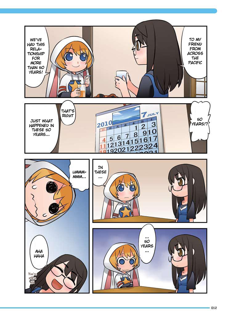 "We've been friends for 50 years!""Wait, but how did we first become friends Usa-Kun?""Well uh erm....... You started being a bully to the rest of the neighborhood, and eventually you threw some rocks and broke my shed. So I came and beat you up. But then I fixed your house and tried to become friends with you. Rus-San started causing trouble so I needed to use your house as a way to keep an eye on him. I've been here ever since.""Oh, is that how it happened? I always forget."