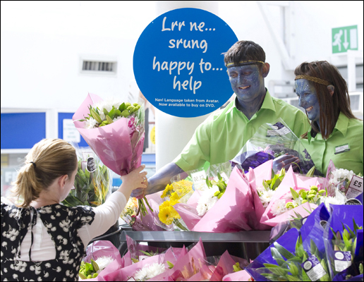 SUPERMARKET chiefs are living on another planet - they are teaching their staff Na'vi, the alien language from AVATAR. Workers in one Asda store will be wishing shoppers a warm kaltxi - er, welcome - tomorrow to celebrate the launch of the smash hit film on DVD.And branches around the country will have shop signs translated into Na'vi. But it could be a problem if you have an urgent need for the tutan (gents). Asda research has identified Pudsey, West Yorks, as the town with the most diehard Avatar fans. So the store there is being given a complete make-over to resemble the mythical world of Pandora. The store's customer services desk, café, toilets and greeting signs will all be given the Avatar treatment. http://www.newsoftheworld.co.uk/news/794866/Asda-people-learn-to-speak-Na-vi-Supermarket-managers-are-training-their-staff-to-speak-the-Avatar-language.html