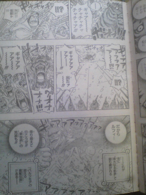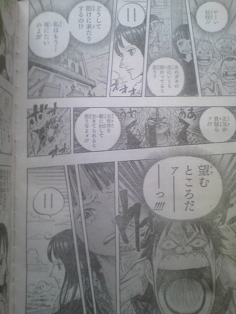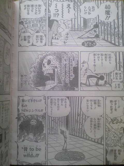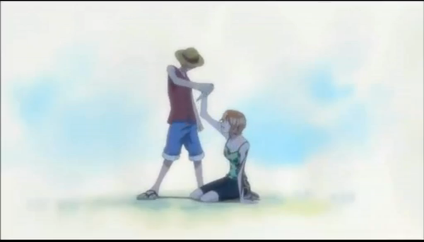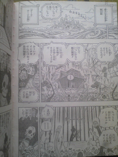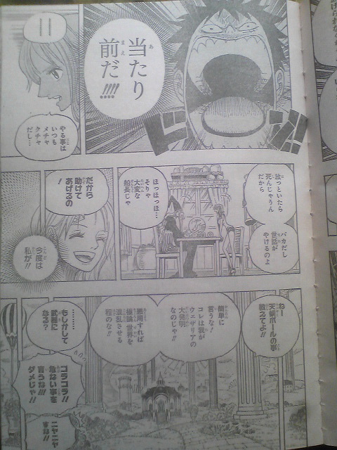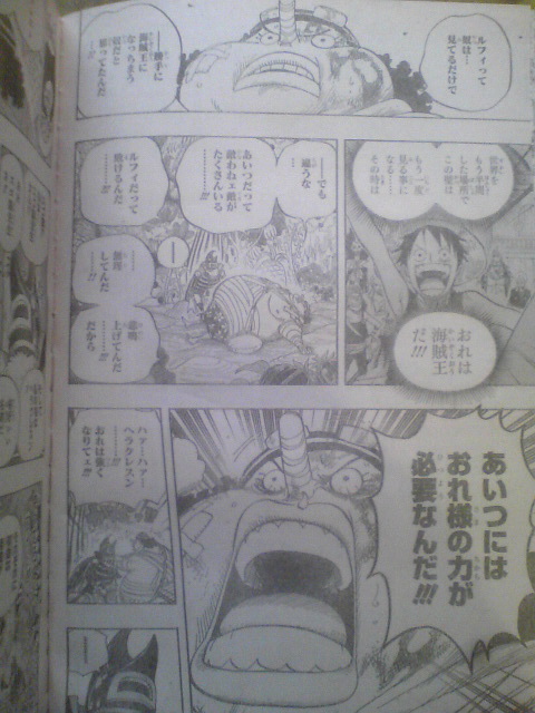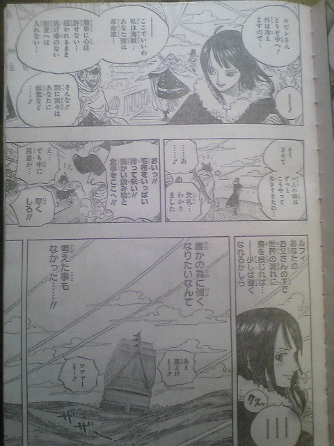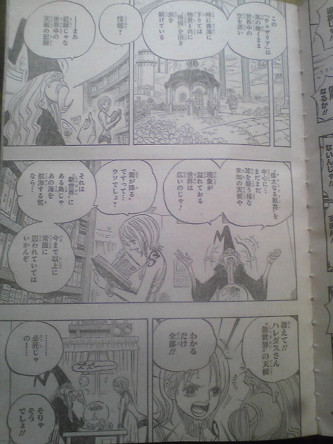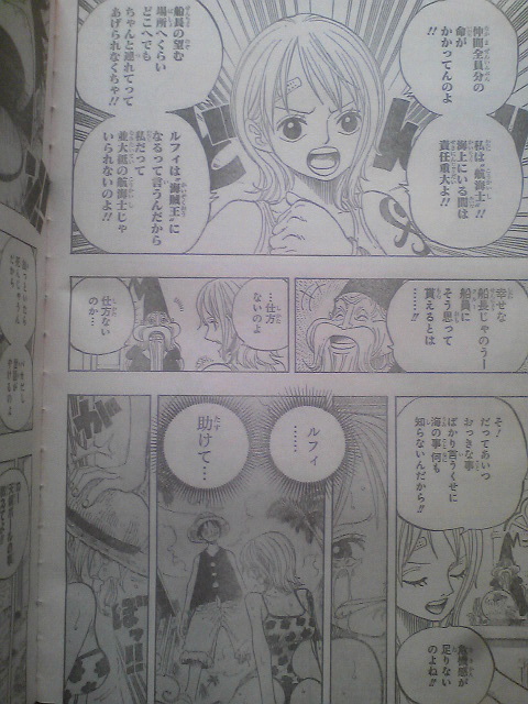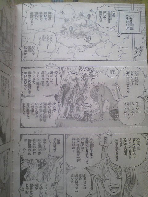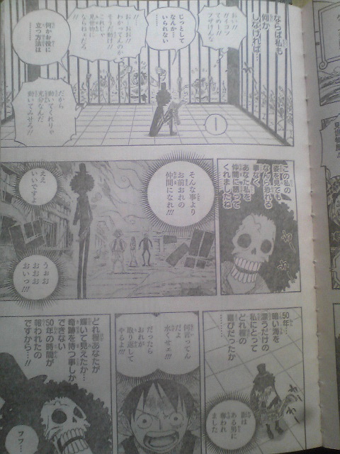The small sky island of Weatheriaresearchers: We can't forgive this thieving cat!! We should strip her of everything and expel her from this nation!!!Nami: I'm sorry I'm in deep regretresearchers: No, we can't trust you!!Nami: To show my regret I'll dive into the sea.... please forgive me in the next life.researchers: Nooooo we made her cry!!! Don't be so hasty lady, we don't mean to persecute you to that extent!!Don't choose death at such age!! We've said too much, sorry!!Nami: Oh ok, I'll forgive you!! I'm gonna study about the weather here, okay?researchers: huh!?Nami: Oh, and my name is Nami. You can call me Nami-san. Oh, and I need a house to live in!Nice to meet you, sky grannies! Time to get busy!researchers: Huh!? How come it's us that needs to be forgiven!? That makes no sense!!Damn, what just happened!?p2Haredas: This Weatheria floats the sky as the wind blows, and sometimes even go down to the Blue Sea to gather both supplies and information to continue our journey.Nami: information?Haredas: Well, such as records of the weather from all around the world.With the Grand Line as its center, there are many phenomenon of unbelievable weather! The world is massive!Nami: Rains of lightning...? Is this for real?Haredas: That's an island in the New World. If you plan to travel that sea... you'll have to think outside of the box even more!Nami: Mr Haredas, tell me about the weather in the New World! Everything you know!Haredas: You sound desperateNami: Of course I am!!p3Nami: The entire crew's life depends on me!! I'm the navigator!! I have great responsibility while we're out on the sea!!I have to be able to take them wherever our captain wants to go!Luffy wants to be the Pirate King, then I can't just be ANY navigator!!Haredas: What a lucky captain he is, to have his crew look out for him so much!Nami: I can't help it...Haredas: It can't be helped?Nami: Yeah!! He always talks big, but he knows nothing about the sea!!Nami (flashback): Luffy... help me...p4Luffy (flashback): OF COURSE!!!!Nami: .... he's always so reckless. If I leave him be, he'll die. He's so stupid, I have to take care of him.Haredas: Hohoho, sounds like a disastrous captain!Nami: That's why I have to help him! (It's my turn to!)Nami: So tell me about the weather ball!Haredas: It's not so easy!! This is a great invention of the Weatheria!!In the wrong hands, it could create chaos to the entire world!Nami: ....... so could you make a weapon out of it?Haredas: Hey now, don't say such dangerous things!! No!! And wipe that grin off your face!p5Grand Line, The Pin-holder (Kenzan) Isle, Teena Geena Kingdomannouncer: Come see for yourself!! Look at his appearance, it's that of a skeleton!!And he only has one joint on his arm!! Is there a stranger creature than this in the world!?crowd: Hey, stop with the fake, exhibitioner!!announcer: huh? Is there a problem?crowd: He's not moving at all!! That's just a figure!!announcer: Huh!?Brook: (Luffy made up his mind...!!)p6Brook: (Then I have to do something too!)exhibitioner: Hey skeleton! Stop screwing around!!Brook: I can't just sit here....exhibitioner: (Oh good! You understand!! That's right move!! Otherwise this wouldn't be a show!)Brook: What is there I can do to be of his use....exhibitioner: (We just want you to move!! That's all, just move!!)Brook: (Even when you saw me, you weren't afraid, and you asked me to join)Luffy (flashback): I don't care about that, just join my crew!Brook: (flashback): Sure, no problemBrook: (That was such a joy after sailing the dark sea for 50 years...)Brook (flashback): My shadow has been stolen by someoneLuffy (flashback): Hey, don't hesitate like a stranger!! I'll get it back for you!!Brook: (You have no idea how much you looked like a bright shining light to me... my 50 years of waiting for a miracle was finally paid off!)p7Brook: 40 degrees!! Oh, too hard!!exhibitioner: Whaaat!? What the heck is that!?crowd: It moved!! It's really talking and moving!!crowd: That's gross!! What is this creature!?Brook: If I lower any degree from 45, I slip and fall....crowd: The skeleton is moving!!! Gyaaa!!!Brook: (But when I finally over come this, perhaps I will be more of use to Luffy....!!..... no wait, maybe I should look for something else.)crowd: ...!!! He has a guitar!! What is he doing!?Brook: For show? Sure, why not, say whatever you want. My dictionary no longer has the word "lonely" in it.Anyways, aren't you people bored of just watching?Listen to my new single!! "Bone to be Wild"!!!p8East Blue, the massive bridgeRevolutionary: What made you change your mind?We're glad you did though, Mr Dragon has always wanted to meet you.Revo shipmates: [We're getting on the ship, and escorting Nico Robin to Vertigo!]Robin: If I knew there were people like that, I wish they'd come see me earlier.Revo: I.... am sorry, we didn't have the information that you were with Crocodile...Robin: Fufufu, it's just a joke. I'm teasing you. I'm sorry, but I'm glad it ended up this way.Revo shipmates: We're set sailing!p9(flashback): Kill that child!! She shouldn't be alive!! She's a survivor of the demons of Ohara!!(flashback): You monster!!(flashback): How much do you think is on that kid's head?Robin (flashback): Why did you come to save me!? I said... I want to die!Spandam (flashback): Are you insane!? Don't you think you'll survive declaring the entire world as your enemy!!Luffy (flashback): Bring it on!!!!p10Revo: Ms Robin, please come inside. It's cold out here.Robin: No, I'm fine here. I'm a pirate... and you're revolutionaries...I can't trust you that easily to walk into a room with nowhere to run...Revo: Please, we mean you no harm!Robin: Please leave me be. When I was alone, I lived this way all the time...Revo: .....!! I'm sorry, I understand.Bring her tons of blankets!! And warm food and drink as well!!Revo: But... we have them ready inside....Revo: Just hurry up!!!Robin: (Luffy, if I leave myself under your father's wings in the turning tide of the world... I 