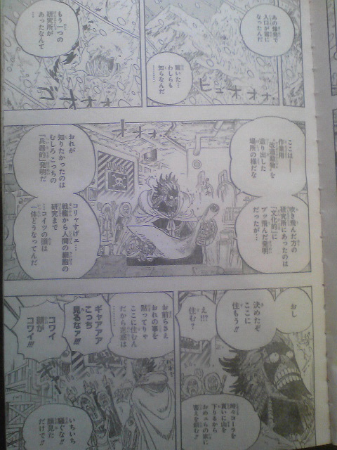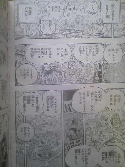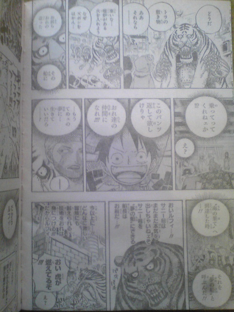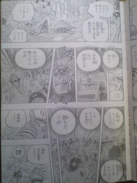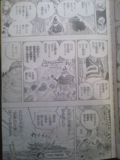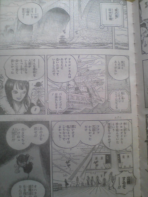 SPECTRUM(スペクトル)がタイトルThe title is SPECTRUM.扉絵はエースサボルフィの青年時の絵、サボの顔は出てないよwThe opening page is Ace-Sabo-Luffy as young men. Sabo's face doesn't appear.各自のパワーアップの為の決意の回だ(ゾロは今回いなかった)It's a chapter about each one's decision to power-up. (Zoro isn't in it this week)ナミは天候の勉強、骨は弱点克服(45度から40度へw)Nami studies weather, Brook conquers his weak point (From 45 degrees to 40 degrees, hah)ロビンはドラゴンに会いにバルディゴへ。Robin goes to Baldigo to meet Dragon.フランキーは虎の毛皮かぶってまたひと騒動wFranky wears a tiger skin and causes another riot.ウソップも本当の狙撃の王に成る為にヘラクレスン先生に弟子入りUsopp, in order to become a real sniper king, becomes apprentice to Heracles.
