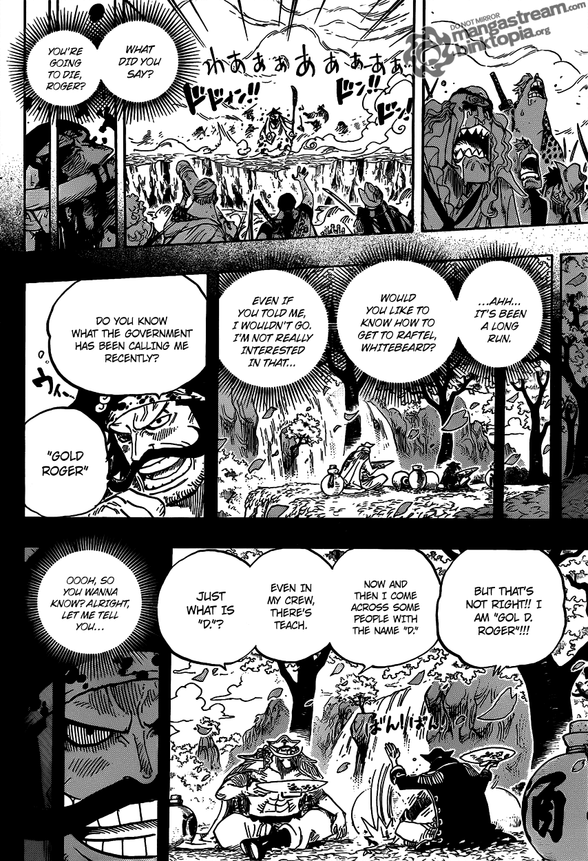 >ChopperHow did Doctor Kureha know about Roger and the Will of D?I doubt that unknown biological parentage will ever become an issue; from Bellemere to Whitebeard, we've been taught that that sort of thing doesn't really matter. You may have a point with Zoro, though.