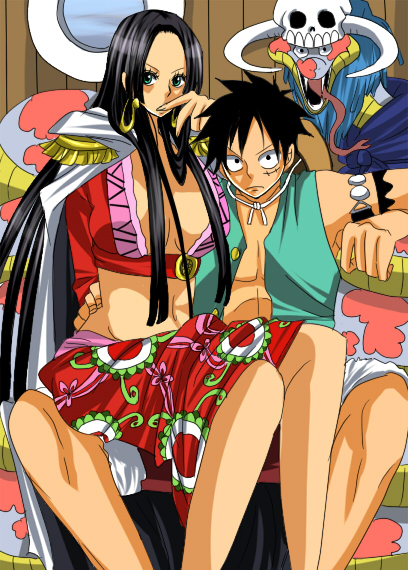 I can see where the LuffyxNami, LuffyxRobin, even the LuffyxZoro people are coming from, but the most realistic pairing in this romanceless One Piece universe is Luffy and Boa.She's clearly shown more feelings and dedication to Luffy than anyone else. I mean, nothing says "I really love you" like helping the break-in to the world's most infamous and dangerous prison.