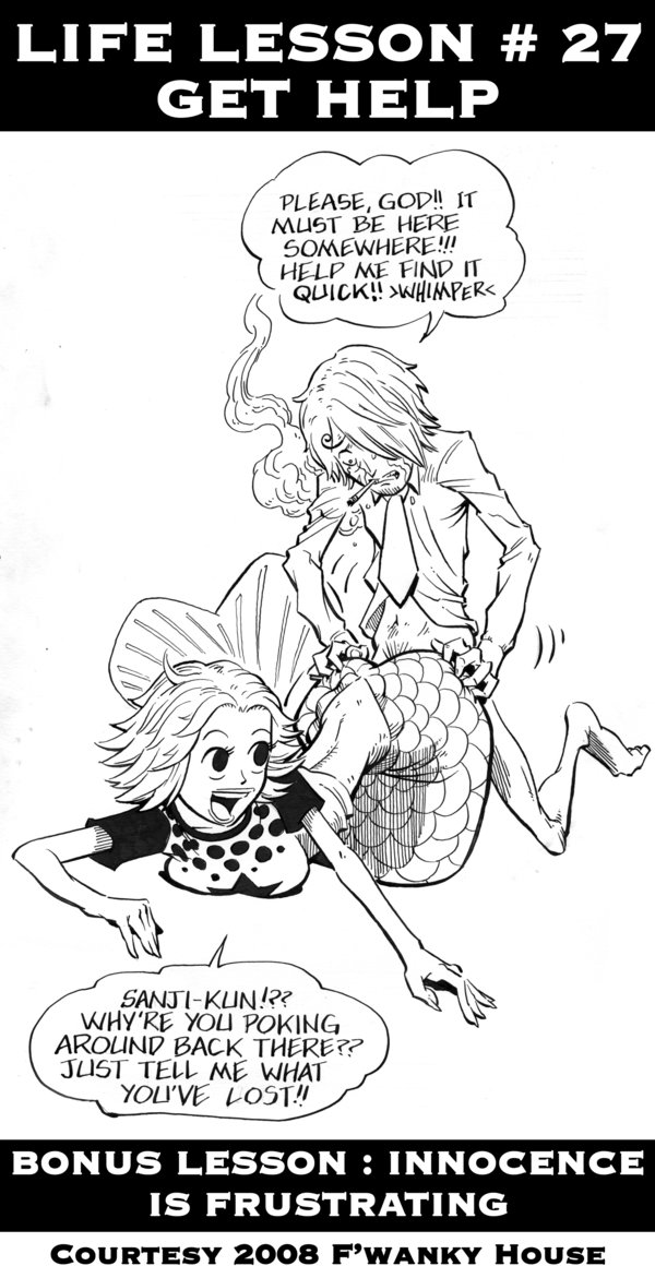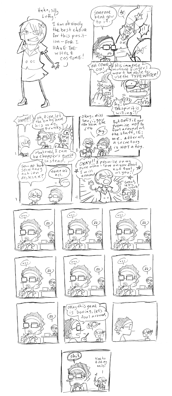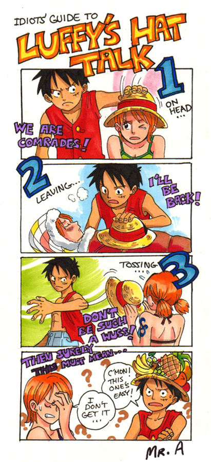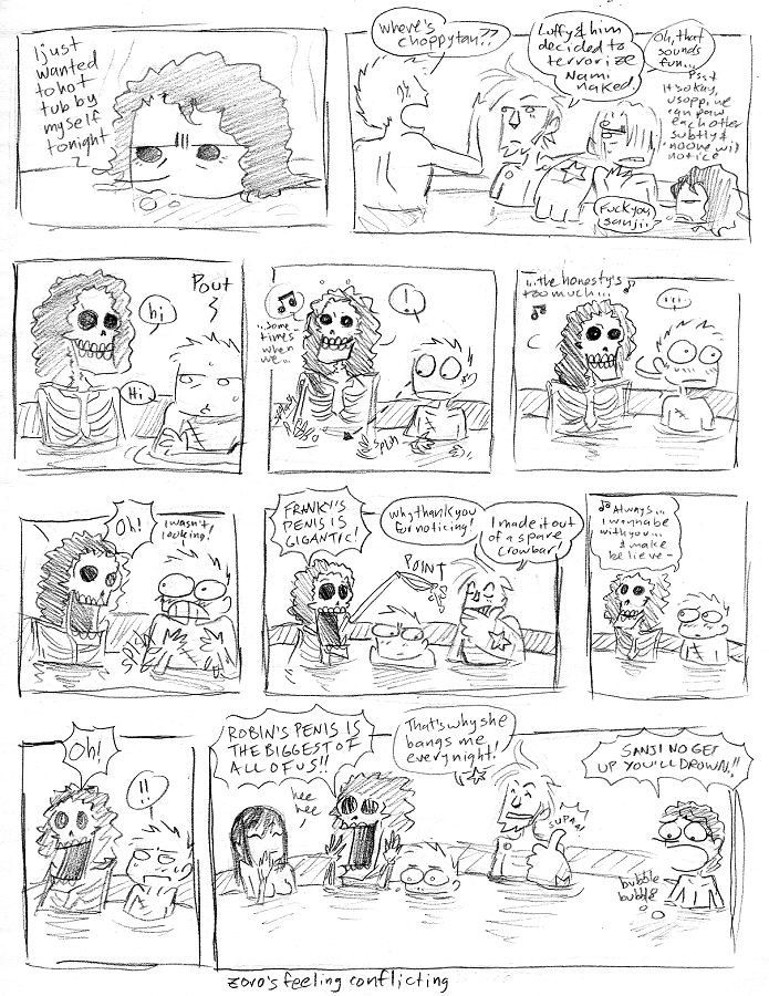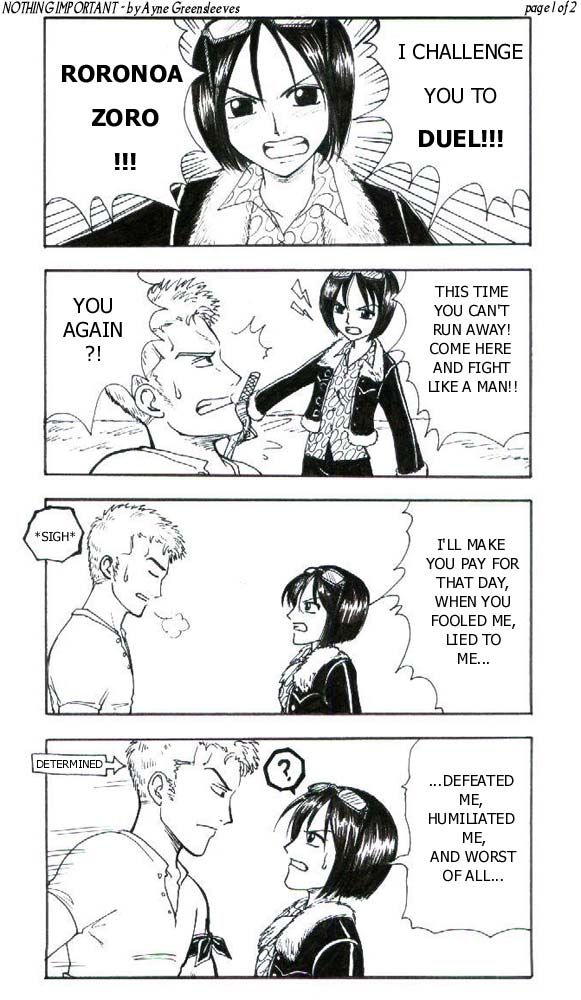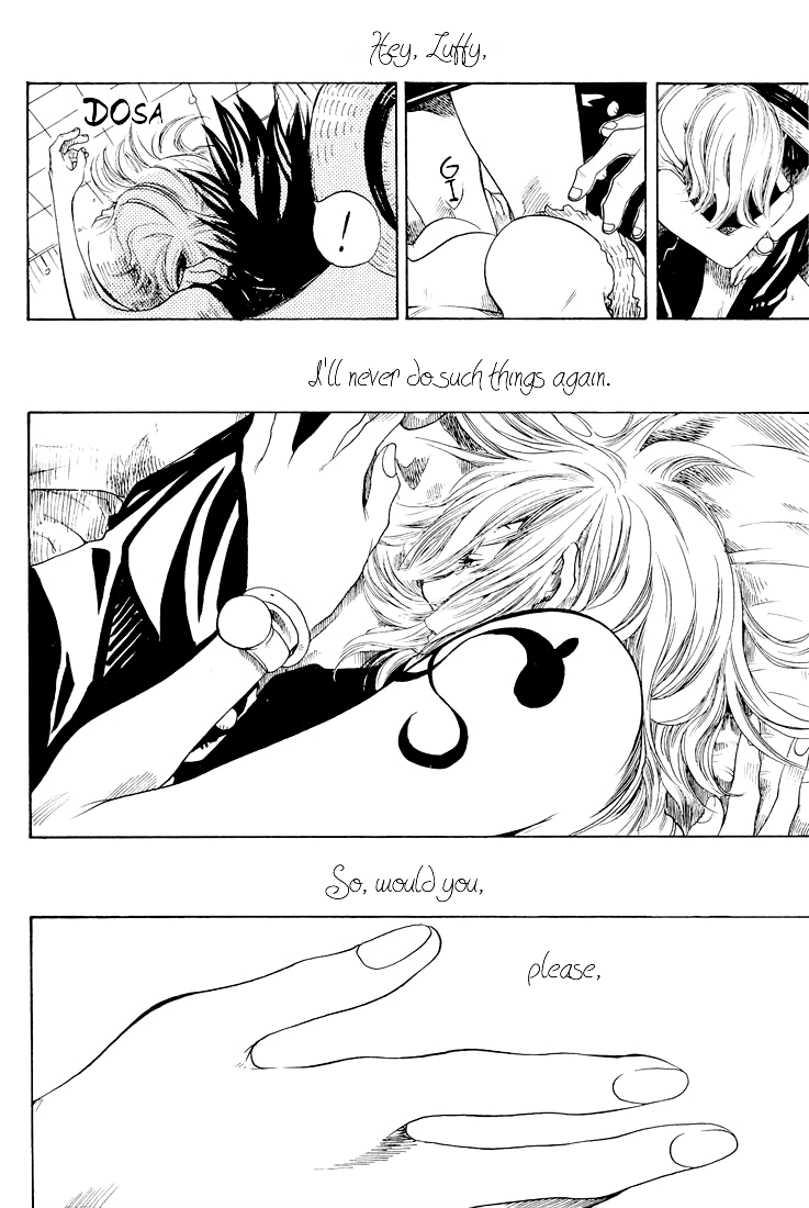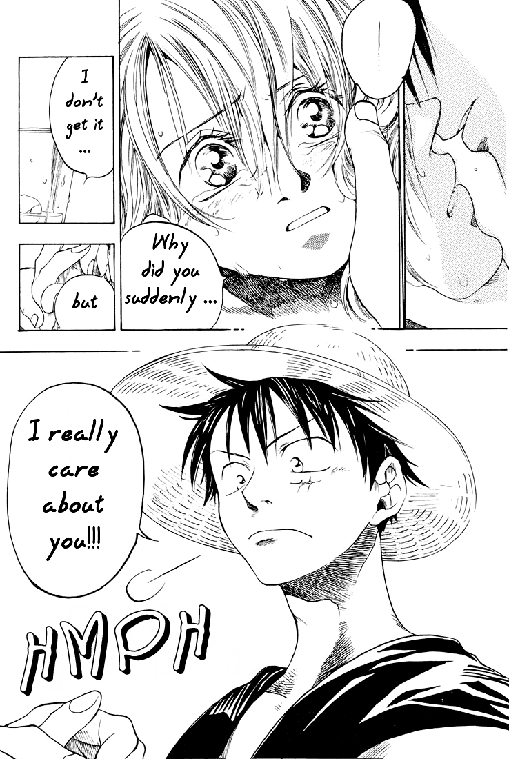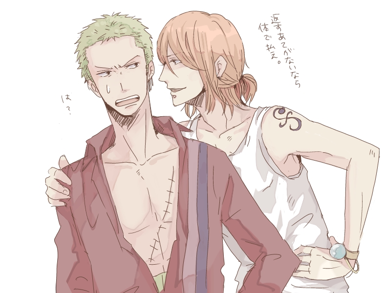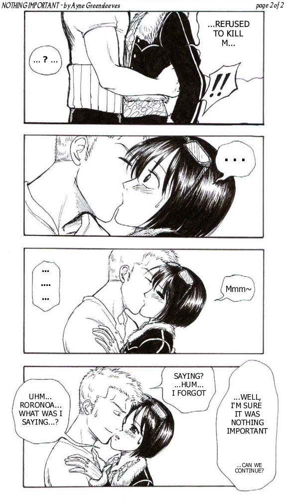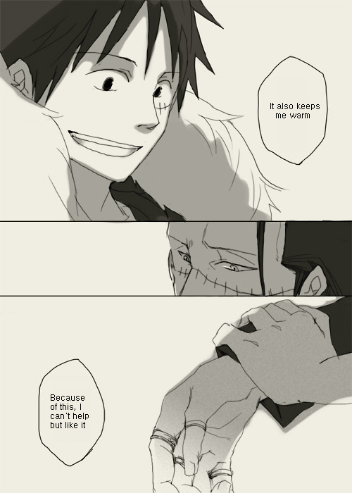 >>1847Yeah, I like "teenagers on a boat" scenarios, but I also like to suspend disbelief and think about how romance would work between the characters. I'm gay like that.Incidentally, your statement also summarizes what I think Luffy's approach to sex would be like. Since he's completely oblivious about it, after he discovers it he wouldn't view it in the same way most people do (i.e. something totally awesome and yet somehow dirty). He'd be like, "This is a fun thing to do with [sexual partner(s)], and it makes [sexual partner(s)] happy, so I enjoy it!" Assuming this isn't a "free love" scenario, someone would probably have to explain that it's not something you go around doing with everyone you like.>>1857For the purposes of shipping, I like to imagine Zoro as thinking something like that but actually being deeply sexually frustrated, which would of course be played up for laughs as much as possible."Whoops, dropped my hat!""PFFFFFFFFFFFFFFFFFF">>1867Ain't no shame in that! Plenty of cute fanart out there. Pic related.