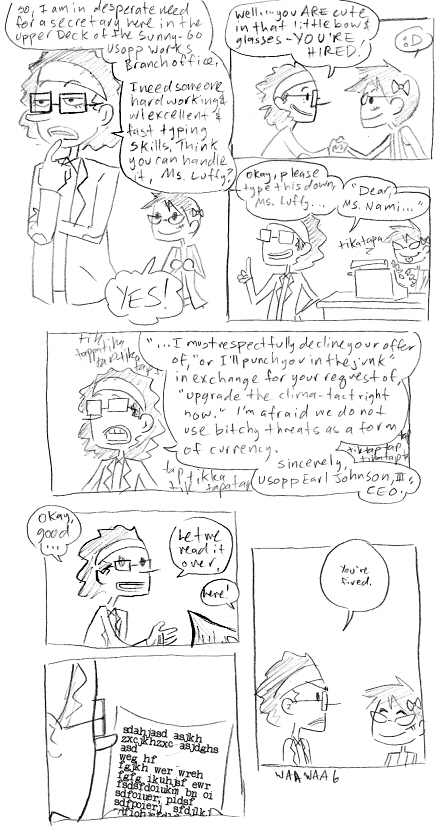 >>1362For some reason, I like the idea of Franky and Robin getting all flirty and then all of a sudden, "Mr. Eiichiro would like to see you in his office."And then they're standing in front of his desk looking kinda bashful and he's like, "You know my policies on workplace relationships."