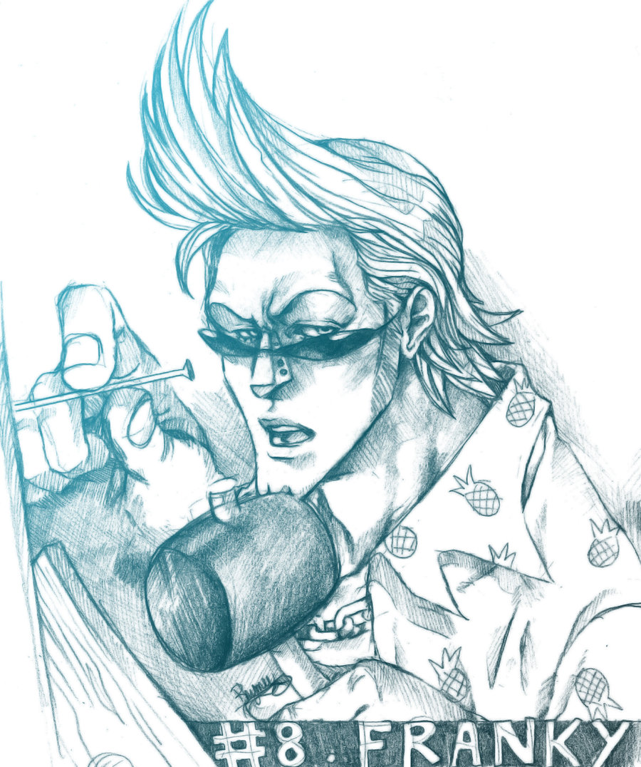 Franky is my favorite StrawHat. Going through water 7 I was like "Who the hell is THIS stylish dude? Woah, THAT'S Franky? But he's so SUUUUPER~!" The dancing and music in the anime only cemented it. However I was ridiculously sad when I thought "Oh darn, too bad he's not a principle character." Then I realized they NEEDED a Shipwright.... and then I realized he looked EXACTLY like Luffy's drawing all the way back at the start of the arc. Oda you loveable bastard.He needs way more moments to dance. Hell, just put him and Brook in a room together and brace for SUUUUPER~ YOHOHOHOHOHO.