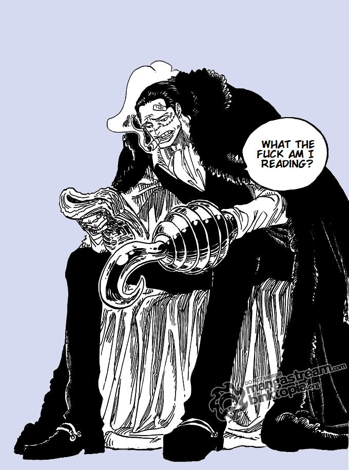 >"Why are fangirls attracted to Crocodile?">"Here's why.">"You're a fangirl so I'm not listening to you."Don't ask questions you don't want answered.And the only reason that people find Crocodile hotter now than during the "Whitebeard vs. World Government" arc is because his behavior is more evocative of the way he acted back in Alabasta what with the scheming and the shit-eating grins.