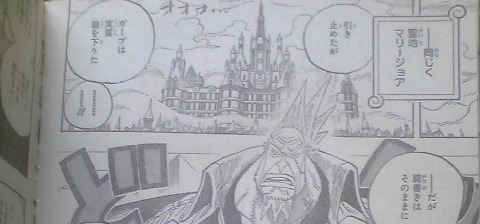 Chapter 594: MessageThe Five Elder Stars are having a meeting.Redline, the holy city of Mariejoa, The Room of the Five Elder StarsES1: Well, this Strawhat Luffy is never short of news is he?Though oddly understandable, considering he's the grandson of Grap.ES2: How is he connected with Rayleigh...? I can't believe he is coming back out to the stage of history after all these years.ES3: And Jinbei is completely turned against us now. We were hoping for him to become the symbol of peace between the races... it's too bad.ES4: The balace of the three powers is in shambles. How should we fill in the three vacant seats for the Seven Warlords?ES5: We should wait till the forces in the New World make their moves. Surely the faction territories amongst the pirates will change.We must choose someone more influential...ES1:In the New World, Blackbeard is already on his move.I heard one of those 100million+ rookie was taken out by him already.ES2: No surprise, he knows Whitebeard's territory very well.ES3: Amongst the pirates going after Whitebeard's vacant seat, I'd say Blackbeard is leading one stop ahead.There's never been a person who ate two devil friuts reported in history.ES4: The only one capable of stoping him would be.... one of the Four Emperors. (rest cut off)ES5: The "D"s always causes trouble...! Just like Portgas.... (rest cut off)Meanwhile, in Marine HQ....Brandnew is reporting Strawhat Luffy's infiltration of Marineford.Luffy, along with Rayleigh and Jinbei, suddenly appeared at Marineford, and took over a marine ship.They sailed and circled around Marineford once, in a tradition of "water funeral".Then Luffy boldly infiltrated the plaza alone, and went to the Ox bell and rang it 16 times.Then he tossed a bouquet into the ruin of the plaza, and bowed his head in prayer.At Kong's office, Sengoku is meeting with the World Government Commander-in-Chief Kong.Apparently Sengoku is resigning from his position.It seems Garp has alrady visited Kong to do the same.Kong convinced both of them to stay with the marines to train the younglings.He is saddened to see two marines who led the force at the frontlines since Roger's age stepping down.Sengoku agrees to stay in the marines keeping the title, but recommends Aokiji as the next Fleet Admiral.Meanwhile, at the medic room, Coby and Helmeppo are recovering.The doctor tells Coby the symptoms he is suffering is a form of haki.He explains that Vice Admiral class marines all can use haki.Coby feels uncomfortable about the "strong presence of others" he is feeling.The doc tells him to go learn more about haki from Garp, so that he can control it.Helmeppo seems jealous that Coby is a step ahead of him, and wants to catch up.At Aokiji's office, Smoker is chatting with Aokiji.Aokiji wonders what Luffy's "Sixteen Bell" message means.Smoker doesn't care, and asks him what happened to his request to be transferred.Aokiji tells Smoker he must be nuts wanting to go to G5. It's infamous for problems.Marine GS 5th division... otherwise known as the New World outpost.Meanwhile the New World is in turmoil....Several Supernovas have arrived at various islands.Hawkins: I'm sorry, can you repeat that? I couldn't hear you well.Brownbeard: I said, I am BROWNBEARD! The almighty Brownbeard, with bounty of 80 million!!!Remember my name!! This is MY territory!!Hawkins: Oh, I see. Your name is so stupid, I thought I heard you wrong.Let me tell you two things.... first, I hate jokes.Brownbeard: Joke!?Hawkins: And second.... I see death in your future.Enraged by this, Brownbeard pulls out a knife to attack Hawkins... bad move.Capone is eating a meal in his ship, when... a massive black ball in the sky gravitates his ship to it.With some screams, the ship is engulfed into the Gantz... I mean black ball. (and according to the summary, crushed)Luffy is on the Amazon Lily ship, being tendered by the amazons.He apologizes to them for making them sail so long.He asks them what they are doing (pinching him and stretching him)They are watching over Luffy so he stays put to heal his wounds, by the order from Hancock.Hancock is resting after being so excited over Luffy.Luffy wonders if his crew got his message.Meanwhile, around the world, the Strawhats are reading the papers.Chopper: I get it Luffy!! I understand your message!!Franky is seen with half his face blown off, and other parts of his body damaged.Zoro is the only one who seems to be confused (according to the summary) reading the news.back to the supernovas...Kid is seen crucifying a pirate who dared to fight them.The pirates say they where just about to leave the New World, and plead mercy to let them go so they can return to "paradise".He says he is disappointed that this is what New World has to offer... cowardly, weak pirates.Kid is reading the newspaper, and sees Luffy infiltrating the Marineford again.The meaning of the bell is explained by Killer.Normally, you ring 8 times at the end of the year.Then 8 times again at the start of the year.Ringing the bell total of 16 times is a traditon of the marines.In other words... the bell is a symbol of ending and starting of an era.Kid wonders if that's Luffy's message to the world that the era belongs to him now.His crew tells him it has to be a reason like that, if he was willing to go back and face his trauma of losing his brother.Urouge and his crew find themselves stumped in front of an island they cannot enter.The island is under constant bombardment of lightning strikes.An old woman appears, and offers umbrellas.Those in the New World refer to the first half of Grandline as... paradise.