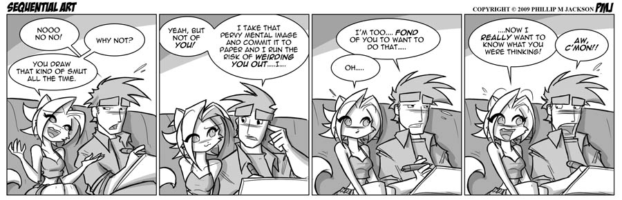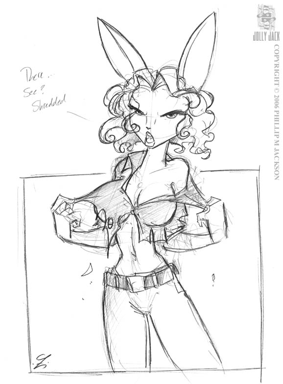 its a lie.jolly jack only used cheesecake to become popular (and $$$). his intention was always to get recognized on a legit level.Phil's catalogue of sketch porn is very limited for a reason. There is a very file line between cheesecake and sketch porn. Adam Hughes, legit, palcomix guy, never will be legit. As Kirk Lazarus said, "Everyone knows you don't go full retard"Plus, Phil doesn't put certain characters into sexual situations since they are based on family/friends he knows IRL.