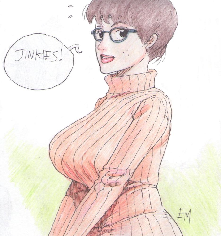 >>49319>>49297Thanks, my numero uno fan, haha. I have five hours of life-drawing class every Friday, so I reckon my bodies will only continue to improve over the next while.I'm still only new to drawing hardcore stuff, trying to work my way out of the softcore safety zone, lol.I'm afraid its no Other Mother, but since you reminded me I'll do one tomorrow (Sunday) for ya, if I get the chance that is. Here's a Velma. Also; colours for once!
