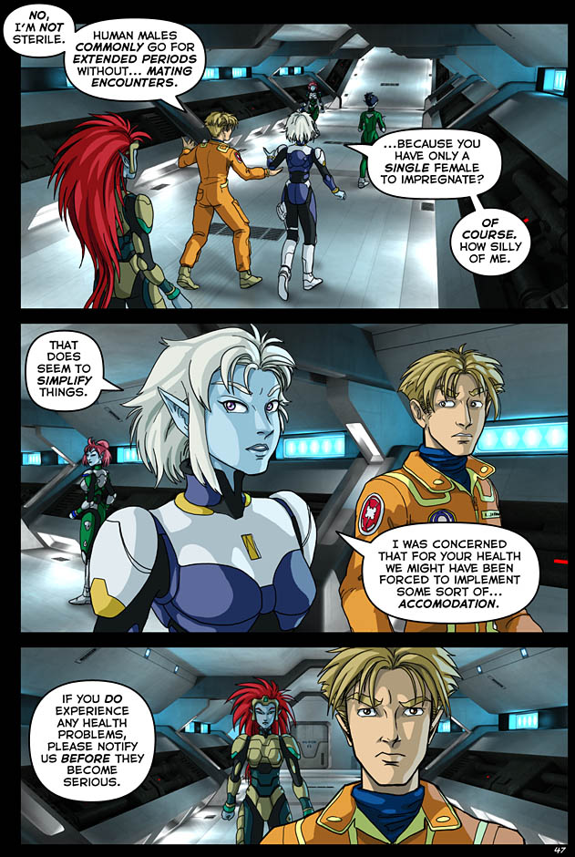 Sequential Art. Scarlet gets into Pip's stash of porn and all manner of innocently-curious hell breaks loose. Sort of a 'birds and the bees' thing gone horribly wrong. Kat, Art and even Pip (or fear of what Kat would do to him) would try to handle the subject delicately, where as Scarlet is spontaneous and lacking boundaries. This doesn't mean that she would jump into a sexual act like a bad hentai. However she did spend her early days naked and wouldn't be shy about exposing herself.