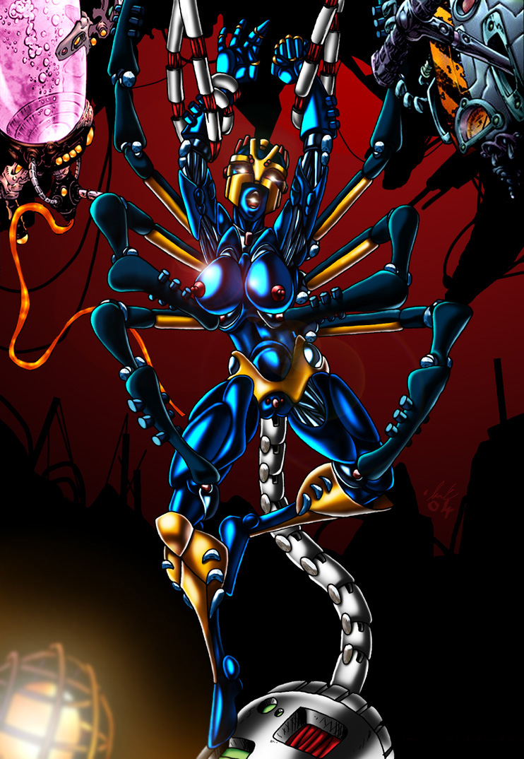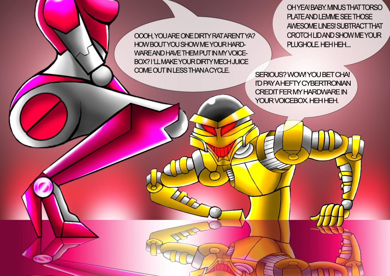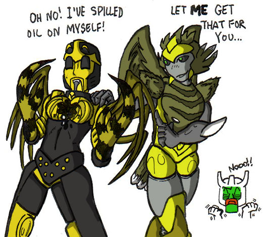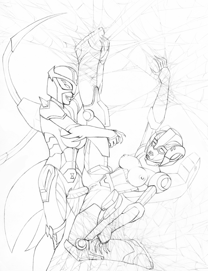 Silverbolt carried Blackarachnia into the closeted weapons room of theLycoda. His grip was steady, like she weighed no more than a two-handedquasar blaster. There he discovered, between the rows of armaments, awide fold-out recharge bed awaiting them, secretly installed for justsuch an occasion."Very thoughtful of you, my beloved."Her claw was tracing over his feathers, sliding in between them likecold poison. Pleasurable, and yet unnerving, much like her fanged teeththat were brushing against the fuel pump on his neck."Down, Rover."While laying his beloved gracefully on the bed, Silverbolt wrapped hiswings around them both, enclosing her in his presence. He then placedhis arms around her waist, sighing contentedly at the perfect arch ofher hips. His sparkling silver armor felt soft, and cool as rain, buthis circuits ran hotter beneath his parts.They began the slow removal of each other's outer armor."Oh... dark poison of my heart... what if I had lost you?""Ummm... you'd need to find a different antidote?""Our love cannot be cured, beloved, for more poison is my only remedy.""More poison is the cure, Rover."Blackarachnia's claw was scratching around Silverbolt's chest plate,making the removal slow... and tingling his sensors with her tricks. Thespider's legs around her arms caressed around his wings and chest,entwining him, as his feathers entwined her.Silverbolt began to pant, as his hands moved up to Blackarachnia's chestplate, finding the tricky snaps on either side, which always managed toscratch his fingertips. He found his own chest plate had been removed,suddenly, and Blackarachnia's claw dipped into the wiring, twisting itmercilessly, setting his cervos on fire.She cackled softly, as Silverbolt let out a small howl of pain orpleasure. Or both.But either would have satisfied her.Nudding the last of her chestplate aside with his nose, Silverboltkissed her neck as the guards over their sparks unfolded. Closing anylast distance between them, Blackarchnia and Silverbolt's wiring meshedtogether, causing their golden and black optics to burn white with theconnection. Fragmented memories, thoughts, and white-hot circuitssizzled and flashed over each's optics. Another thrilled cackle softlyescaped Blackarachnia's throat... as their sparks met.A quiet vibration spread through their protoforms as the electric heatclimaxed. Every part stinging with the deepest pleasure, Silverbolt feltas though he would literally melt into her wild and dark connection.While thrown into his starry furnace of passion, Blackarachnia wasequally lost in the extremes of Silverbolt's strong, fierce, loving,compassionate spark.This is what had changed him, and her, and made all that was known fallinto doubt. For only this was real, real enough to forget wars, orsides, or distinctions of any kind, where two were one.Silverbolt would have stayed, belonged to this love as long as he could.But Blackarachnia feared it, as much as she loved it, and both sensedthis doubt, so both drew apart.As their optics regained their color, Silverbolt saw the confident, darktemptress staring back at him, and believed that he had broken theconnection. Their outer plating still stripped away, Silverbolt moved toBlackarachnia's side, and kept a wing over her like a blanket."Stay with me... my love. The stars and wars and betrayals of theuniverse... will never conquer us, as long as your spark still burnsnear mine. Our bond mends all my damages, and must never be severed.""I don't know...if I can, Silverbolt. My survival and my ambition... arealways at odds. But I'm selfish enough to never want to compromise, Iwill always want you, Rover.""You mistake your virtues for faults, my love, but I shall not mistakethem. My heart will always be your command, Blackarachnia... now andforever."