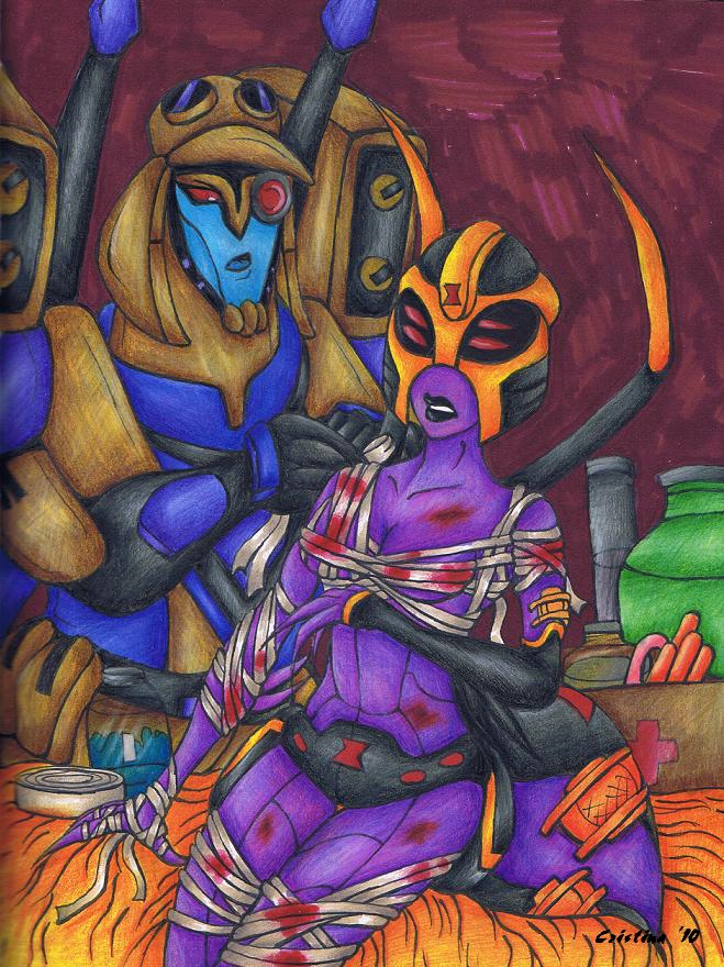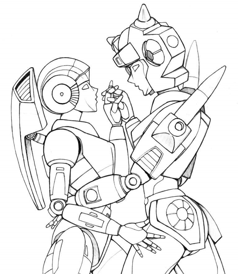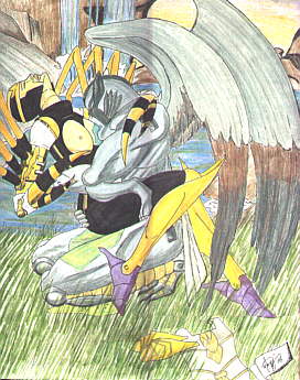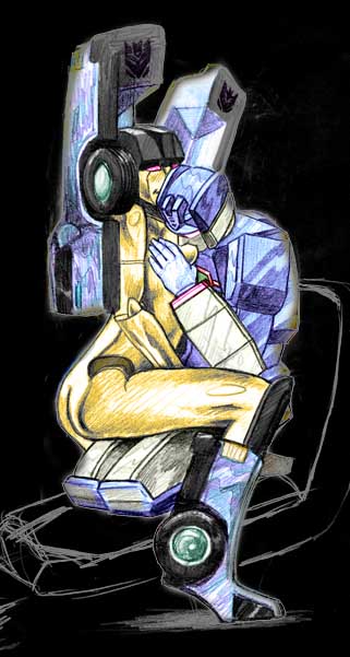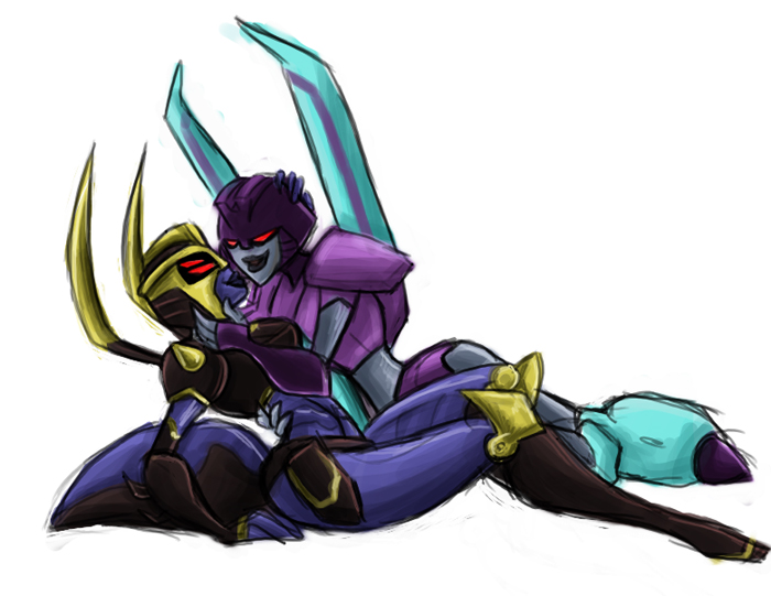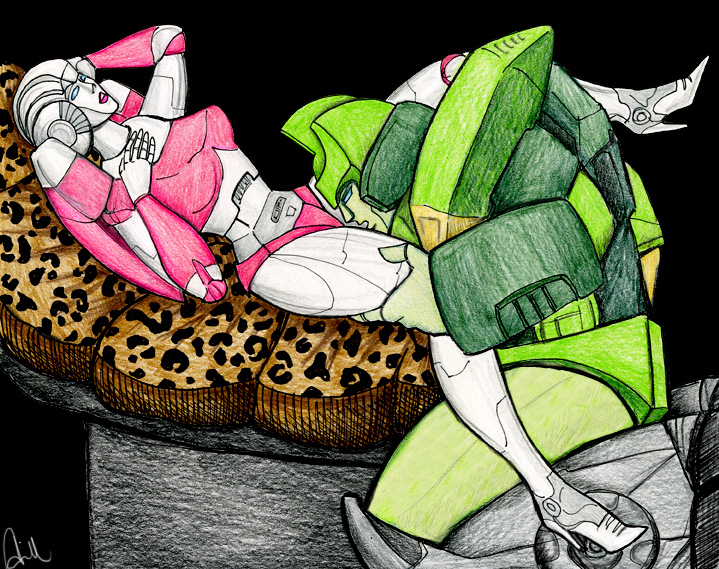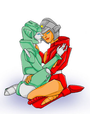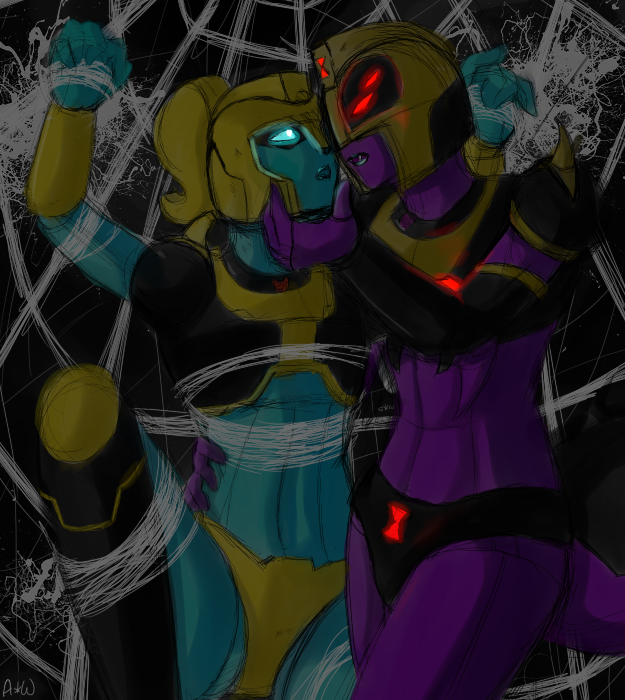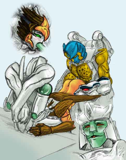 Silverbolt carried Blackarachnia into the closeted weapons room of theLycoda. His grip was steady, like she weighed no more than a two-handedquasar blaster. There he discovered, between the rows of armaments, awide fold-out recharge bed awaiting them, secretly installed for justsuch an occasion."Very thoughtful of you, my beloved."Her claw was tracing over his feathers, sliding in between them likecold poison. Pleasurable, and yet unnerving, much like her fanged teeththat were brushing against the fuel pump on his neck."Down, Rover."While laying his beloved gracefully on the bed, Silverbolt wrapped hiswings around them both, enclosing her in his presence. He then placedhis arms around her waist, sighing contentedly at the perfect arch ofher hips. His sparkling silver armor felt soft, and cool as rain, buthis circuits ran hotter beneath his parts.They began the slow removal of each other's outer armor."Oh... dark poison of my heart... what if I had lost you?""Ummm... you'd need to find a different antidote?""Our love cannot be cured, beloved, for more poison is my only remedy.""More poison is the cure, Rover."Blackarachnia's claw was scratching around Silverbolt's chest plate,making the removal slow... and tingling his sensors with her tricks. Thespider's legs around her arms caressed around his wings and chest,entwining him, as his feathers entwined her.Silverbolt began to pant, as his hands moved up to Blackarachnia's chestplate, finding the tricky snaps on either side, which always managed toscratch his fingertips. He found his own chest plate had been removed,suddenly, and Blackarachnia's claw dipped into the wiring, twisting itmercilessly, setting his cervos on fire.She cackled softly, as Silverbolt let out a small howl of pain orpleasure. Or both.But either would have satisfied her.Nudding the last of her chestplate aside with his nose, Silverboltkissed her neck as the guards over their sparks unfolded. Closing anylast distance between them, Blackarchnia and Silverbolt's wiring meshedtogether, causing their golden and black optics to burn white with theconnection. Fragmented memories, thoughts, and white-hot circuitssizzled and flashed over each's optics. Another thrilled cackle softlyescaped Blackarachnia's throat... as their sparks met.A quiet vibration spread through their protoforms as the electric heatclimaxed. Every part stinging with the deepest pleasure, Silverbolt feltas though he would literally melt into her wild and dark connection.While thrown into his starry furnace of passion, Blackarachnia wasequally lost in the extremes of Silverbolt's strong, fierce, loving,compassionate spark.This is what had changed him, and her, and made all that was known fallinto doubt. For only this was real, real enough to forget wars, orsides, or distinctions of any kind, where two were one.Silverbolt would have stayed, belonged to this love as long as he could.But Blackarachnia feared it, as much as she loved it, and both sensedthis doubt, so both drew apart.As their optics regained their color, Silverbolt saw the confident, darktemptress staring back at him, and believed that he had broken theconnection. Their outer plating still stripped away, Silverbolt moved toBlackarachnia's side, and kept a wing over her like a blanket."Stay with me... my love. The stars and wars and betrayals of theuniverse... will never conquer us, as long as your spark still burnsnear mine. Our bond mends all my damages, and must never be severed.""I don't know...if I can, Silverbolt. My survival and my ambition... arealways at odds. But I'm selfish enough to never want to compromise, Iwill always want you, Rover.""You mistake your virtues for faults, my love, but I shall not mistakethem. My heart will always be your command, Blackarachnia... now andforever."