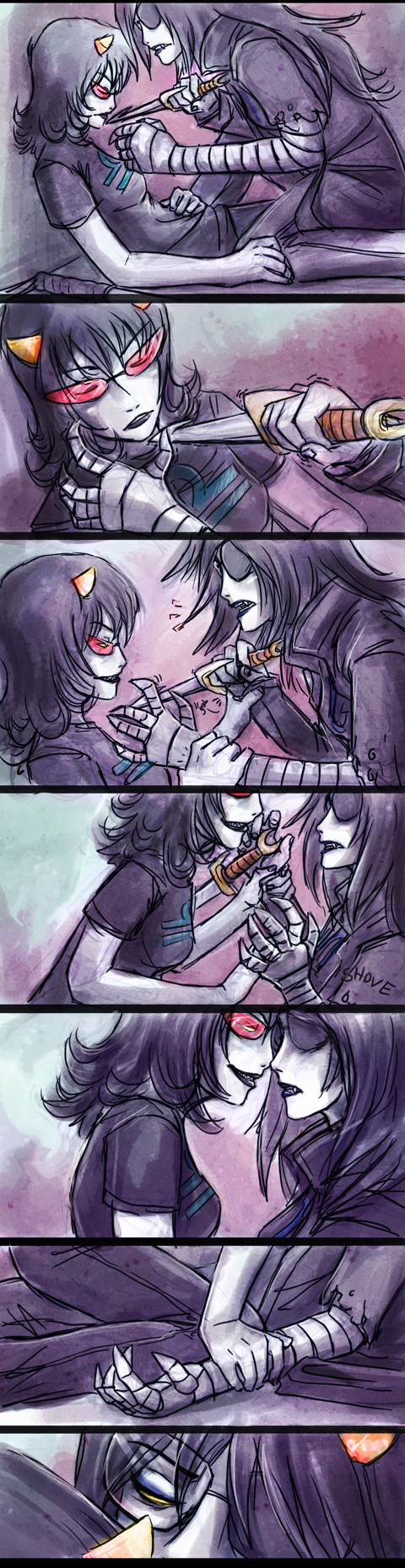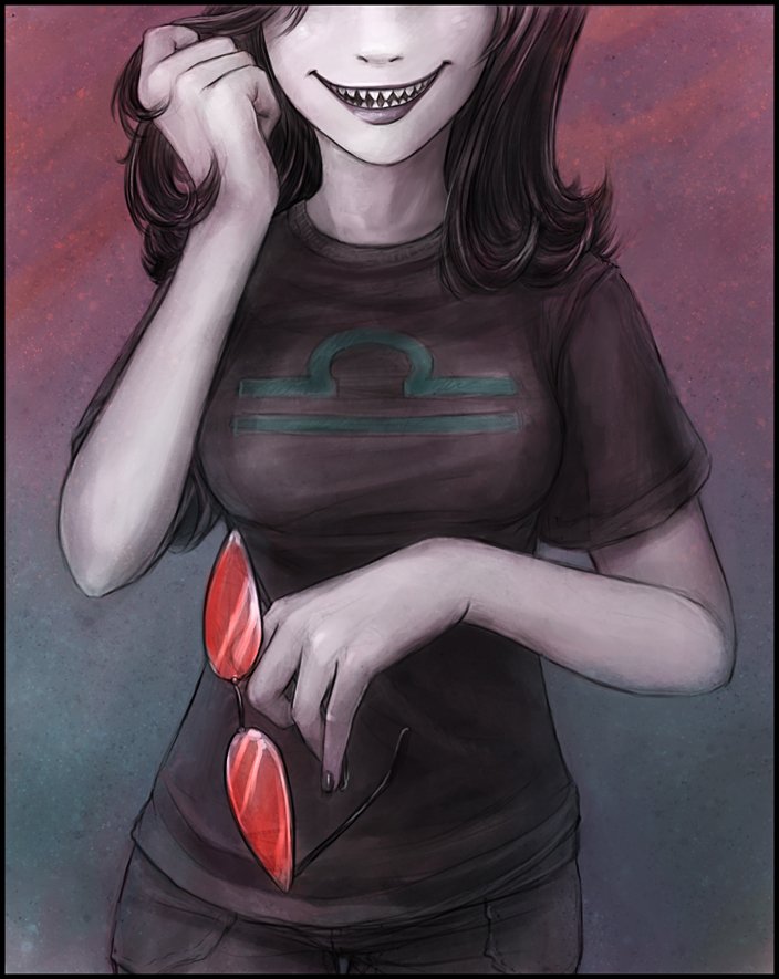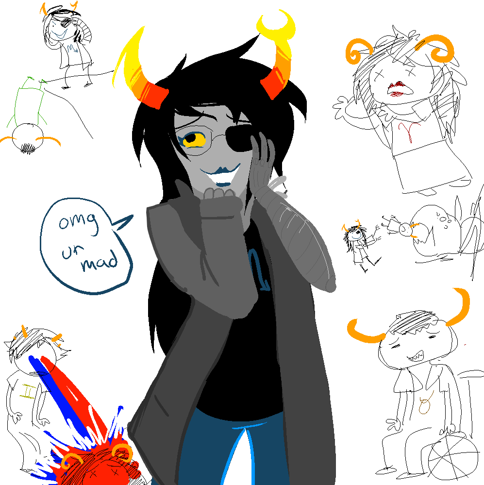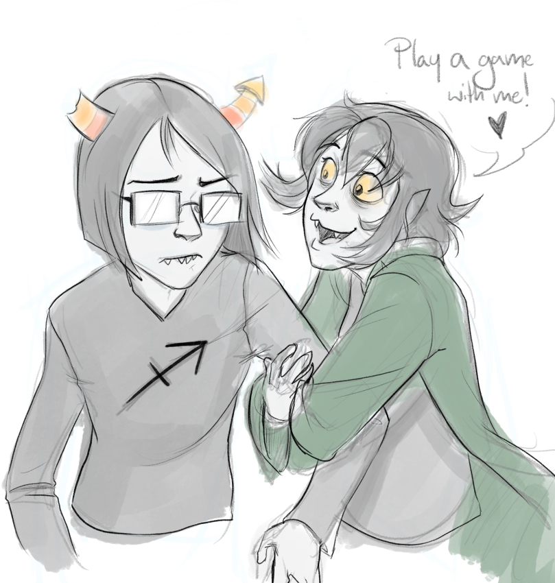 >>68801Vriska's too openly aggressive to be a good manipulator. She has to bully people into doing stuff and resorts to mind control when getting pushy doesn't work, while Terezi lies by omission and misleads them with a smile on her face. If we're going to get into relationship dynamics with that, it'd probably end up with Vriska thinking she's the dominant one, while Terezi pulls all the real strings.oh yeah someone wanted me to draw Karkat/Terezi so I kind of did only not really. Mostly I did it just because I like drawing his various states of anger/disgust.