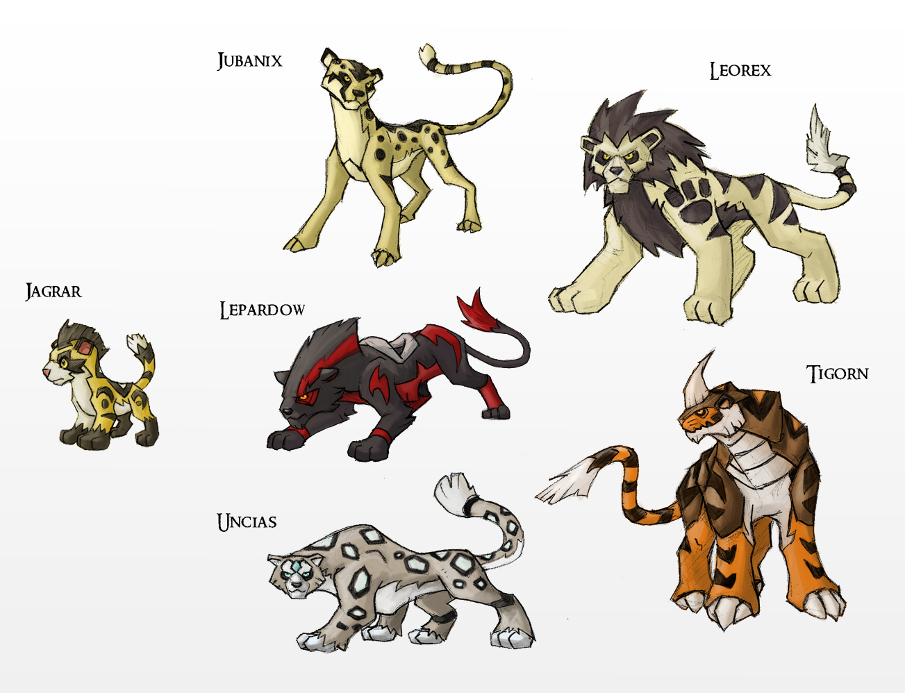 CATSCATS EVERYWHEREJagrar - Cub PokemonNormal(evolves at level 20)Jubanix - Quick Cat PokemonNormal/Ground(evolves from Jagrar if SPEED is its highest stat)Leorex - Cat King PokemonDark/Ground(evolves from Jagrar if DEFENSE is its highest stat)Lepardow - Shadow Cat PokemonDark(evolves from Jagrar if ATTACK is its highest stat)Tigorn - Armor Cat PokemonRock/Fire(evolves from Jagrar if Sp. DEFENSE is its highest stat)Uncias - Snow Cat PokemonGround/Ice(evolves from Jagrar if Sp. ATTACK is its highest stat)In short, it's a feline Tyrogue.