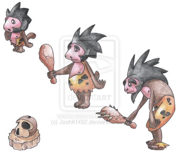Basic Stage: Monkan - The Primative PokemonType: Rock/NormalAbility: Tribal - The more it loves its trainer, the greater its accuracy.Name Meaning: Monkey-Man[Evolves at lvl 30]An ancient pokemon revived from a fossil. It was highly curious and would investigate anything, I was one of the first bipedal pokemon, but often reverted back to crawling on all fours.---------------------First Stage: Clubecus - The Primative PokemonType: Rock/NormalAbility: TribalName Meaning: Club-Australopithecus[Evolves at lvl 45]After evolving, they became completely bipedal, though it was clumsy, and couldn't hold their club properly and it was often dropped in combat, However, when in the tribes, they would learn from eachother.--------------------Second Stage: Homosapio - The Primative PokemonType: Rock/NormalAbility: TribalName Meaning: Shortened Homo SapienThese prehistoric pokemon are thought to be the first humans. They lived in tribes which fed on fruit and occasionally meat. It never seperated from its club, which it used in combat, and for knocking food from trees. The one with the most impressive club automatically became the leader.