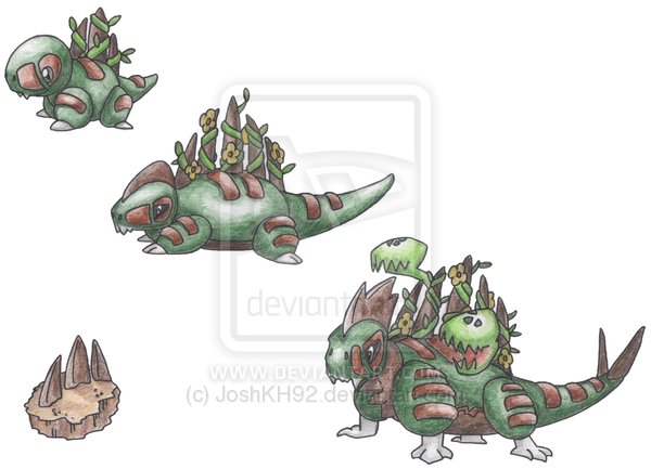 SO MUCH TEXT Basic Stage: Trelidon - The Trellis Pokemon Type: Rock/Grass Ability: Chlorophyll Name Meaning: Trellis-Dimetrodon [Evolves at lvl 30] A prehistoric pokemon revived from a Fossil. They lived in thick jungles long ago, whilst foraging on the forest floor, seeds would fall onto its back and eventually grow up its spines. -------------------- First Stage: Edaphis - The Trellis Pokemon Type: Rock/Grass Ability: Chlorophyll Name Meaning: Edaphosaurus-Trellis [Evolves at lvl 45] Once the seeds on their back started to bloom, it ventured out of the forest and onto the hot, dryland, where its flowers would absorb sunlight, giving EDAPHIS its energy. They were less active on rainy or cloudy days. -------------------- Second Stage: Dimetrelis - The Trellis Pokemon Type: Rock/Grass Ability: Chlorophyll Name Meaning: Dimetrodon-Trellis A Prehistoric pokemon, it lived in the deepest jungles, feeding mainly on plants and berries. The plants on its back were seperate species which fed on bugs and parasites that came close. It has been scientifically proven that these plants were the ancestors of modern CARNIVINE. http://joshkh92.deviantart.com/gallery/