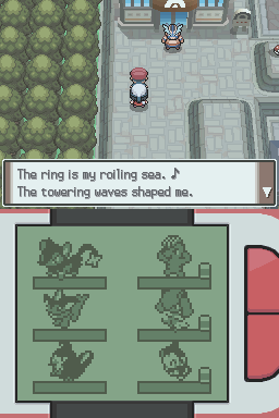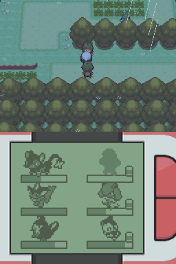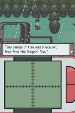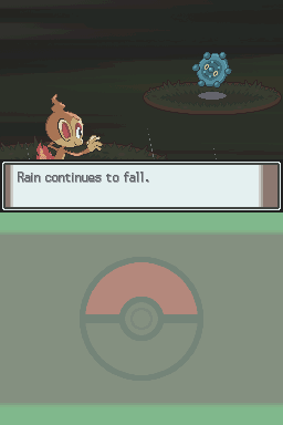 {HOLY SHIT, SON, THAT'S RIGHT, WE'RE BACK AFTER JUST ONE DAY, AND WE'RE READY TO ROCK YOUR SOCKS OFF. WHERE WE LAST LEFT OUR EVER NERVOUS PROTAGONIST, SHE'D JUST EMERGED FROM THE SOLACEON RUINS, TREASURE IN HAND, WITH A NEWLY EVOLVED EEVEE. AFTER A BIT OF MISFORTUNE WITH HER KIRLIA, BELPHEGOR, SHE SET OUT INTO THE WILD ONCE MORE ON HER QUEST.WHAT AWAITS HER THERE IN THE FIELDS? WILL WE EVER FIND THAT FUCKING DAWN STONE? LET'S FIND OUT WHILE WE PLAY...POKEMON PLATINUM~!}H-hey, enough narrating, okay? I'm getting soaked...