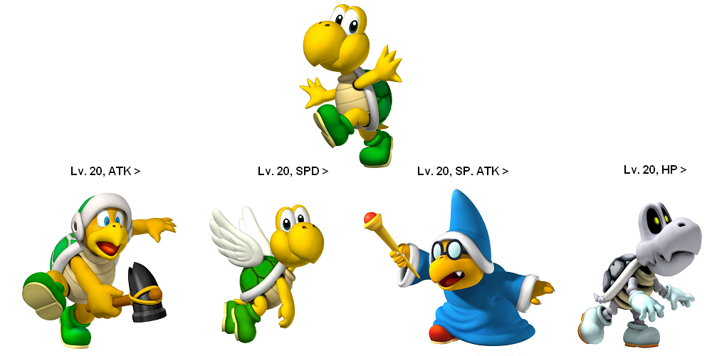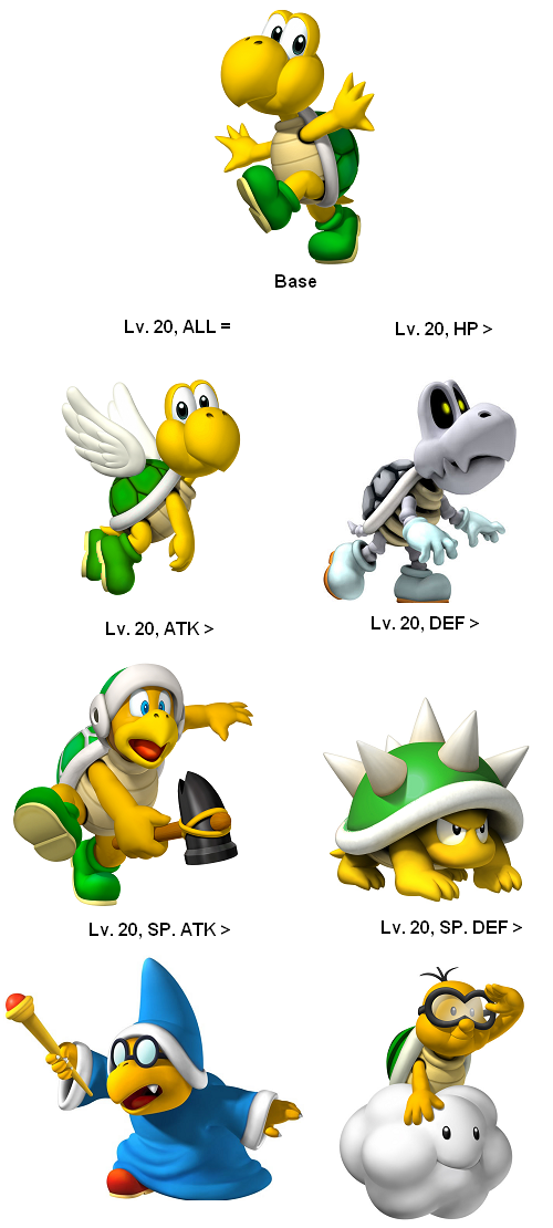 >>8258Oh, and I put some thought into Abilities.Troopa = Shell ArmorParatroopa = Serene GraceDry Bones = FireproofHammer Bros.= Rock HeadSpiny = Rough SkinMagikoopa = Magic GuardLakitu = Levitate