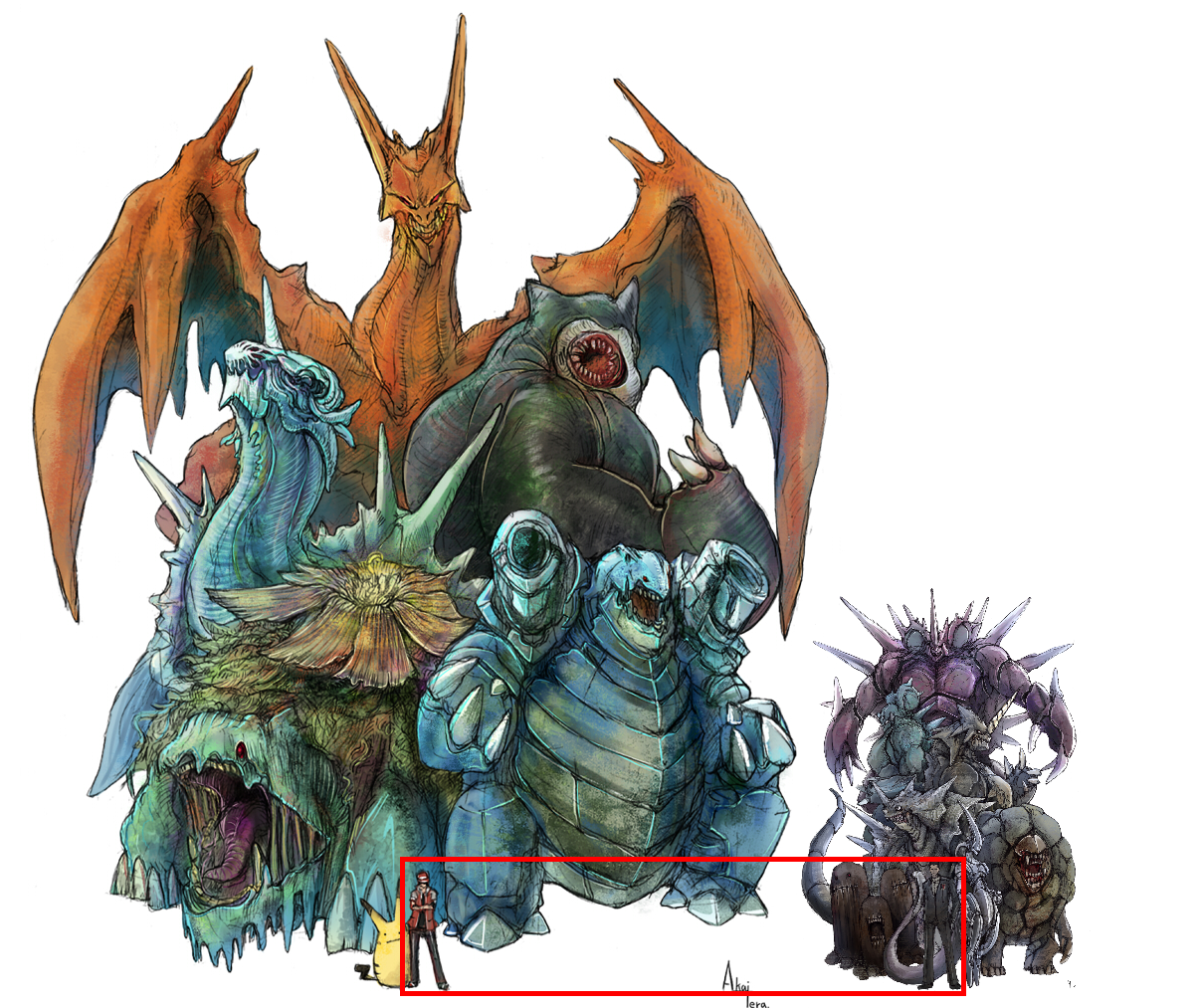 >>9112Perspective be messin' with you, son. See, we're seeing Giovanni from a low angle. By the looks of it, Golem is about as big as big as Venusaur's head, Nidoqueen about matches Snorlax, and Nidoking may even be taller than Charizard.
