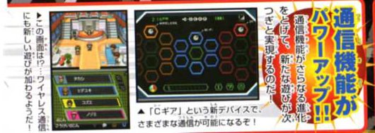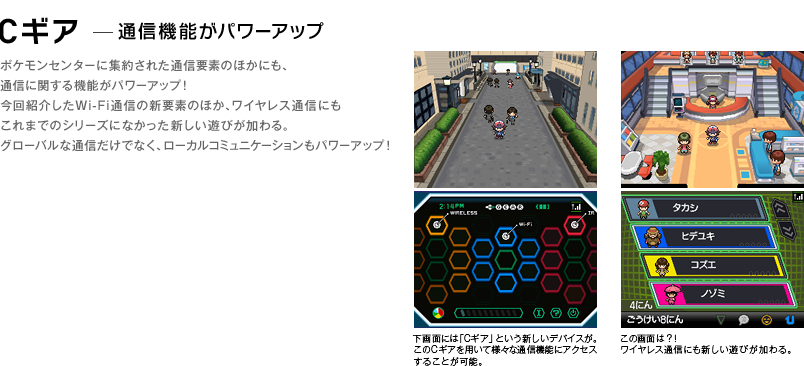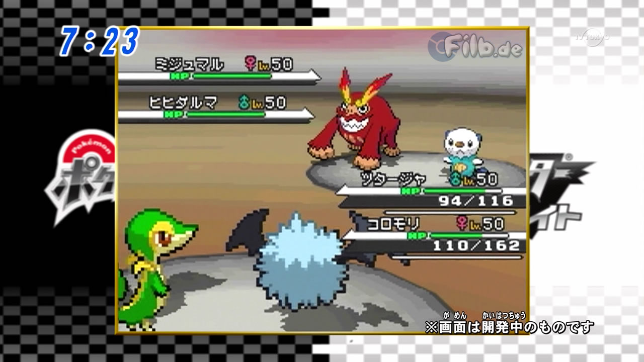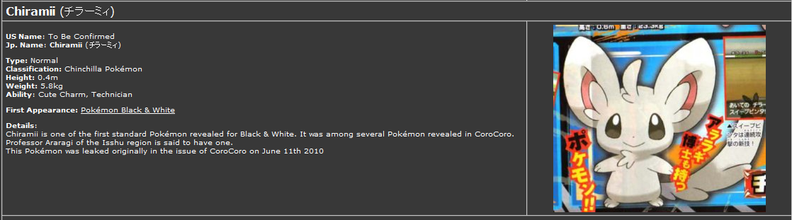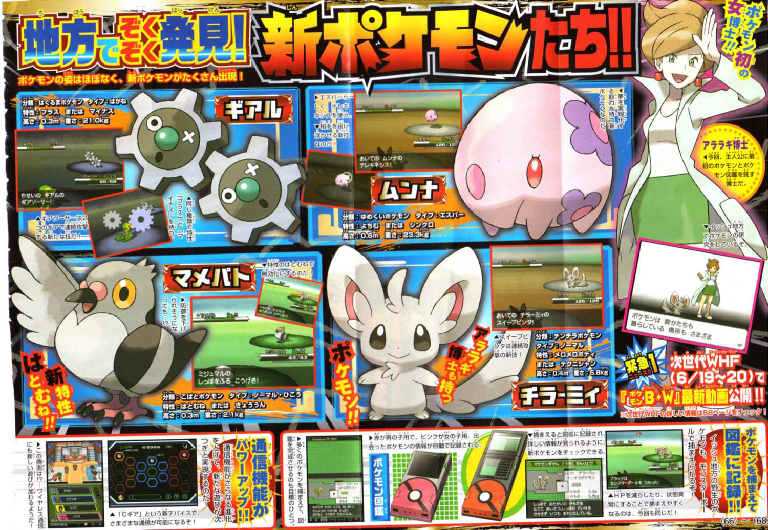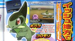 The final details from CoroCoro have come out and have provided the details for all 7 Pokémon within the magazine. For other details, check the previous couple of updates. We'll update this as we do more translations. Please bear with us. Thanks to yaminokame for assistance on the translations.* Details for the Pokémon are outFirst, we have Kibago (キバゴ), the Tusk Pokémon. It is 0.6m tall and weighs 18kg. It has the abilities of Rivalry & Mold Breaker and is a Dragon-type Pokémon. It also has a new attack called Double Chop (ダブルチョップ) which attacks twiceNext is Koromori (コロモリ). It is the Bat Pokémon. It is 0.4m tall and weighs 2.1kg. It has the abilities of Unaware & Klutz and is a Psychic/Flying-type Pokémon. It also has a new attack called Heart Stamp (ハートスタンプ) which makes the opponent Flinch.Next is Minezumi (ミネズミ). It is the Lookout Pokémon. It is 0.5m tall and weighs 11.6kg. It has the abilities of Run Away & Keen Eye and is a Normal-type Pokémon. It also has a new attack called You First (おさきにどうぞ) which allows the opponent to move firstNext is Gochiruzeru (ゴチルゼル). It is the Celestial Body Pokémon. It is 1.5m tall and weighs 44kg. It has the ability of Frisk and is a Psychic-type Pokémon. It has the new attack Magic Room (マジックルーム) which negates the effects of any Items on both you and the opponent for 5 turns..Next is Rankurusu (ランクルス). It is the Amplification Pokémon. It is 1.0m tall and weighs 20.1kg. It has the abilities of Dust-Proof (ぼうじん), which makes the Pokémon not take damage from weather effects & Magic Guard and is a Psychic-type Pokémon.Next is Wooguru (ウォーグル ), possibly derived from War and Eagle. It is the Valor Pokémon, it is 1.5m tall, weighs 41kg and is a standard Normal/Flying-type Pokémon. It has two abilities, one of them Keen Eye and the other is Encourage, the ability Hihidaruma has which boosts the power of its moves but prevents the moves having a secondary effect. It also has a new attack called Free-Fall (フリーフォール). Free-Fall is a two turn attack that has the Pokémon grab the opponent and lift it into the air and then on the next turn falls to the groundNext is Musharna (ムシャーナ ), the evolution of the Pokémon Munna. It is the Trance Pokémon. It is 1.1m tall and weighs 60.5kg. It has the abilities of Forewarn & Synchronize and is a Psychic-type Pokémon. Both Munna & Musharna give off the Dream Smoke. As explained on Sunday, the Dream Smoke is part of the Global Link connectivity. Triple Battles First, we have details on the Triple battles, showing how you can target with the middle Pokémon being able to target all three Pokémon and the ones at the sides being able to target the opposite one and the middle one. You also have the ability to switch Pokémon positions in battle.If a Pokémon in the middle uses an attack that hits all Pokémon, then it will be very powerfulThere is a new ability called Telepathy (テレパシー) which allows the Pokémon to avoid receiving damage from its team-mates.There is also a new attack, name currently not given, which will cause all your team mates to avoid damage from attacks that would hurt all team members such as Earthquake.Global Link The Global Link has two modes. One, where your Pokémon play in a dream and another is an online battling system. It appears that you have the ability to capture Pokémon not in the Isshu Dex within the Global Link and have them transferred back to your game. This can be done in the dream mode. As we said on Sunday, you access the Global Link when you have Musharna, the evolution of Munna.The Game Sync is accessible through the C Gear. Here, you can send a single Pokémon to the computer and the "dream world".In the world of dreams Pokémon have their own rooms that they can play in. They can play minigames with other Pokémon. Pokémon that your Pokémon becomes friends with in the dream world can be taken back to the real worldIf you are registed to the PGL, then you can play "Rating Mode" of "Random Match" at to the global terminal inside of the Pokémon center. It will send your battle results to a server gather them so you can see who is really strong.Version Changes Gochiruzeru and Rankurusu are Version exclusives and Black City & White forest are in the same part of Isshu.There will also be other cities that vary in appearance based on your gameFeatures Using Infared, you have the ability of having speedy battles. This can be 2 or 4 Player. You can also trade this way on the spot from your box. You can automatically exchange friend codes over IRYou have the ability to draw on your friends faces over the Live Caster video chat. Characters in game will also call you on the Live Caster from time to timeThere is also a gentleman in the game which will switch your game from the standard Hiragana/Katakana text to KanjiThere is a feature called Feeling Check that checks players compatibility. One of the things it shows is a game where two people have to keep the same rythmnThe High Link features mentioned yesterday have also been further confirmed and will involve meeting players over WiFi in the Isshu overworld and doing missions for them. This is as close to a MMORPG as we'll getThe C Gear as we knew has abilities in InfraRed, Wireless & WiFi Characters Professor Araragi gives you the Pokémon and says for you to share with your friends, Cheren & BelleIt seems that you, Belle and Cheren all get the starters from Professor Araragi, leaving none left out as all of you are beginning your journey together.Belle is a spontaneous person and is on her adventure against her father's wishes. She is rather unreliable.Cheren is an intelligent guy and will give you helpful tips throughout your journey. He intends to be the champion in Isshu.Indicating that Isshu is far away, the routes have once again reset and will begin with Route 1N is one