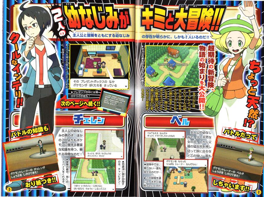 Other news:-The blonde girl with the green hat is named Belle. She's going on her journey even though her dad told her not to.-The guy with the glasses and the jacket is named Cheren, and he wants to be the Champion.-The PC, Belle, and Cheren are all starting their journeys at the same time and between the three of them take all three starters. You're probably friends, but it doesn't explicitly say this.-The girl in the labcoat with the really long hair is named Makomo, and she gives you the C Gear after you do something for her.-Isshu is so far away from the other areas that they have a different map system, so the route numbering is going back to starting with single digit numbers.-Gochiruzeru (the goth loli triangle thing) and Rankurusu (the thing covered in the green translucent aura thing) are corresponding version exclusives in Black City and White Forest.I'd post the relevant screenshots, but I don't know how to bypass serebii's thing that keeps you from right-clicking to save images.
