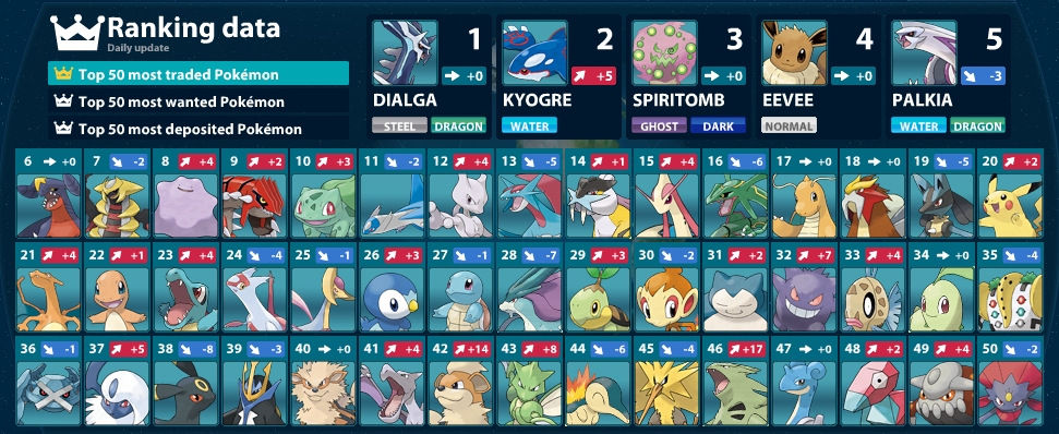 The GTS website (http://www.pokemon-gts.net/) is now closed.Here are trade rankings on the last day of operation.