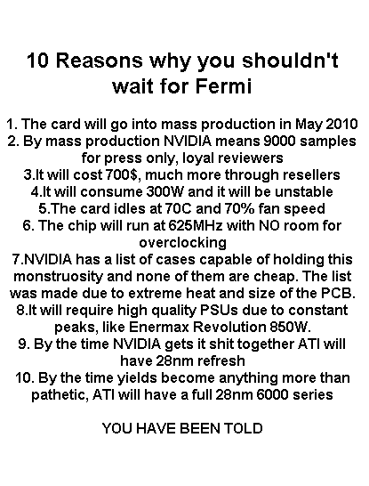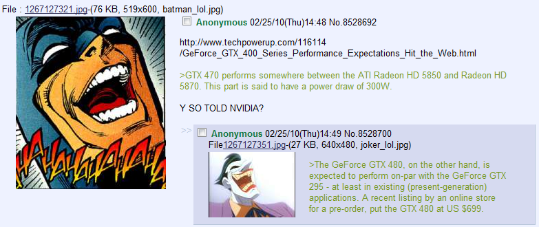 >>352>>nVidia seems to think they can overprice their stuff. I can get a BETTER card from ATI for less than an older card from nVidia.If we're talking about the gaming market, sure. But really I think nVidia's development have gamers as an afterthought and they're really focusing on making GPUs more useful to the sciences and industries and even though I''ll likely never directly see the benefits of this, I actually find it more interesting to follow. Vidya coding and optimization has been a long tradition of half assed releases thanks to the fact that their funding relies entirely on mercurial enthusiasts who don't care so much for innovation as the next step, now. With that in mind, their cards are actually reasonably priced in that the garage mad scientist can easily afford their GPUs to make their calculations though that is a very small niche and I agree that they're really not putting enough effort into reaching out to the enthusiast demographicWith the Quadros and Fermi architecture, I wouldn't be surprised if nVidia moves into academic and commercial GPU production entirely in the future, especially if they don't give the layman user more attention. I really wish they would make cards more practical for folks like us but still, it's nice to see them pushing the envelope in graphic computing.